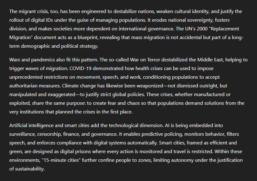 The summary continued: "The migrant crisis, too, has been engineered to destabilise nations, weaken cultural identity, and justify the rollout of digital IDs under the guise of managing populations. It erodes national sovereignty, fosters division, and makes societies more dependent on international governance. The UN's 2000 'Replacement Migration' document acts as a blueprint... Mass migration is not accidental but part of a long-term demographic and political strategy." "Wars and pandemics also fit this pattern. The so-called War on Terror destabilised the Middle East, helping to trigger waves of migration. Covid-19 demonstrated how health crises can be used to impose unprecedented restrictions on movement, speech, and work, conditioning populations to accept authoritarian measures. Climate change has likewise been weaponised... to justify strict global policies. These crises, whether manufactured or exploited, share the same purpose: to create fear and chaos so that populations demand solutions from the very institutions that planned the crises in the first place." "Artificial intelligence and smart cities add the technological dimension. AI is being embedded into surveillance, censorship, finance, and governance. It enables predictive policing, monitors behaviour, filters speech, and enforces compliance with digital systems automatically. Smart cities, framed as efficient and green, are designed as digital prisons where every action is monitored and travel is restricted. Within these environments, '15-minute cities' further confine people to zones, limiting autonomy under the justification of sustainability."