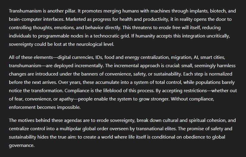 And continued... "Transhumanism is another pillar. It promotes merging humans with machines through implants, biotech, and brain-computer interfaces. Marketed as progress for health and productivity, it in reality opens the door to controlling thoughts, emotions, and behaviour directly. This threatens to erode free will itself, reducing individuals to programmable nodes in a technocratic grid. If humanity accepts this integration uncritically, sovereignty could be lost at the neurological level." "All of these elements—digital currencies, IDs, food and energy centralisation, migration, AI, smart cities, transhumanism—are deployed incrementally. The incremental approach is crucial: small, seemingly harmless changes are introduced under the banners of convenience, safety, or sustainability. Each step is normalised before the next arrives. Over years, these accumulate into a system of total control, while populations barely notice the transformation. Compliance is the lifeblood of this process. By accepting restrictions—whether out of fear, convenience, or apathy—people enable the system to grow stronger. Without compliance, enforcement becomes impossible." "The motives behind these agendas are to erode sovereignty, break down cultural and spiritual cohesion, and centralise control into a multipolar global order overseen by transnational elites. The promise of safety and sustainability hides the true aim: to create a world where life itself is conditional on obedience to global governance."