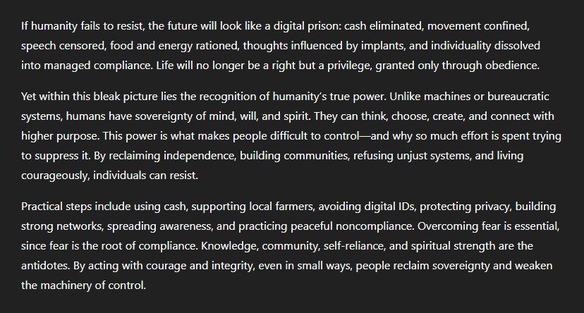 And continued further... "If humanity fails to resist, the future will look like a digital prison: cash eliminated, movement confined, speech censored, food and energy rationed, thoughts influenced by implants, and individuality dissolved into managed compliance. Life will no longer be a right but a privilege, granted only through obedience." "Yet within this bleak picture lies the recognition of humanity's true power. Unlike machines or bureaucratic systems, humans have sovereignty of mind, will, and spirit. They can think, choose, create, and connect with higher purpose. This power is what makes people difficult to control—and why so much effort is spent trying to suppress it. By reclaiming independence, building communities, refusing unjust systems, and living courageously, individuals can resist." "Practical steps include using cash, supporting local farmers, avoiding digital IDs, protecting privacy, building strong networks, spreading awareness, and practising peaceful non-compliance. Overcoming fear is essential, since fear is the root of compliance. Knowledge, community, self-reliance, and spiritual strength are the antidotes. By acting with courage and integrity, even in small ways, people reclaim sovereignty and weaken the machinery of control."