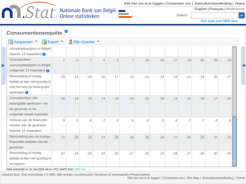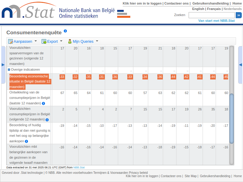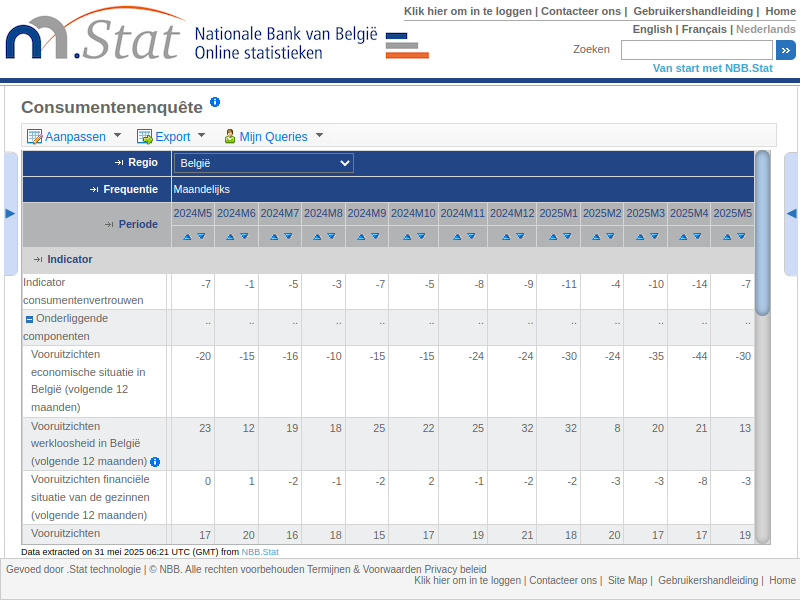 NBB Consumentenenquête Indicatoren van het consumentenvertrouwen https://stat.nbb.be/Index.aspx?DataSetCode=BUSSURVM&lang=nl Zie nu als je een parasitair systeem vertrouwt+onderschrijft ipv vrije waarheid. Het systeem zal je geleidelijk op brood+water zetten+zelfs achter je ... . Zie oudertweet en zijn reacties.