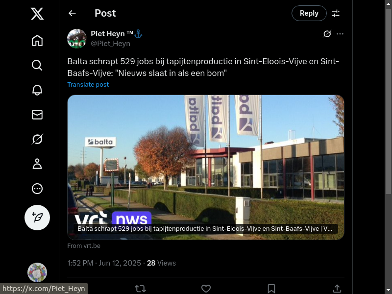 Balta schrapt 529 jobs bij tapijtenproductie in Sint-Eloois-Vijve en Sint-Baafs-Vijve: "Nieuws slaat in als een bom" Zie nu als je een parasitair systeem vertrouwt+onderschrijft ipv vrije waarheid. Het systeem zal je geleidelijk op brood+ ... . Zie oudertweet en zijn reacties.