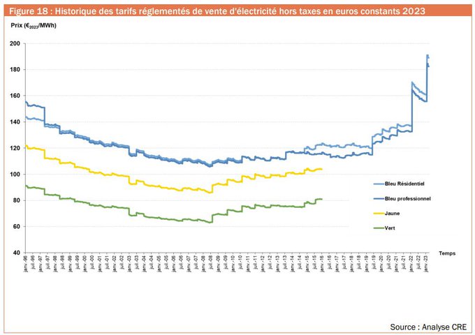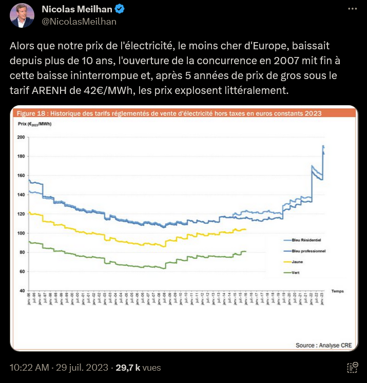 @dupontaignan 58/x) "Alors que notre prix de l'électricité, le moins cher d'Europe, baissait depuis plus de 10 ans, l'ouverture de la concurrence en 2007 mit fin à cette baisse ininterrompue et, après 5 années de prix de gros sous le tarif ARENH de 42€/MWh, les prix explosent littéralement."