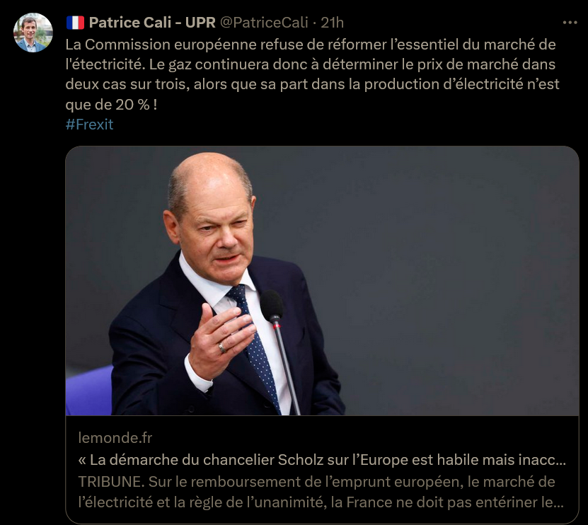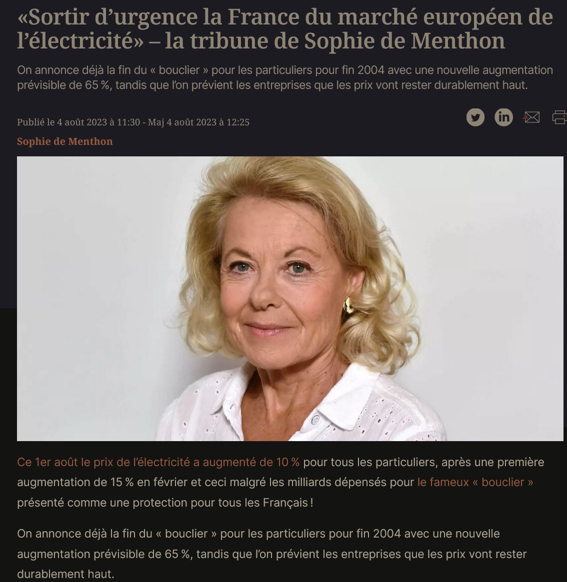 @dupontaignan 59/x) «Sortir d’urgence la France du marché européen de l’électricité» – la tribune de Sophie de Menthon https://www.lopinion.fr/economie/sortir-durgence-la-france-du-marche-europeen-de-lelectricite-la-tribune-de-sophie-de-menthon