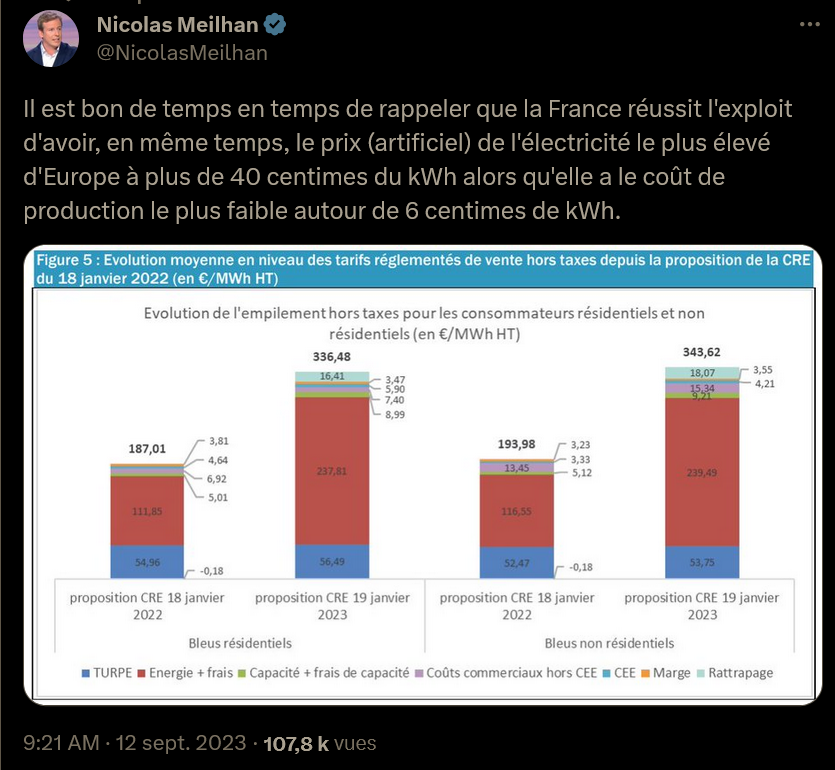 @dupontaignan 62/x) "Il est bon de temps en temps de rappeler que la🇫🇷réussit l'exploit d'avoir, en même temps, le prix (artificiel) de l'électricité le plus élevé d'🇪🇺à plus de 40cts du kWh alors qu'elle a le coût de production le plus faible autour de 6cts de kWh" https://t.co/Dy0G6J6Aqo https://t.co/tLfbCT1ngH