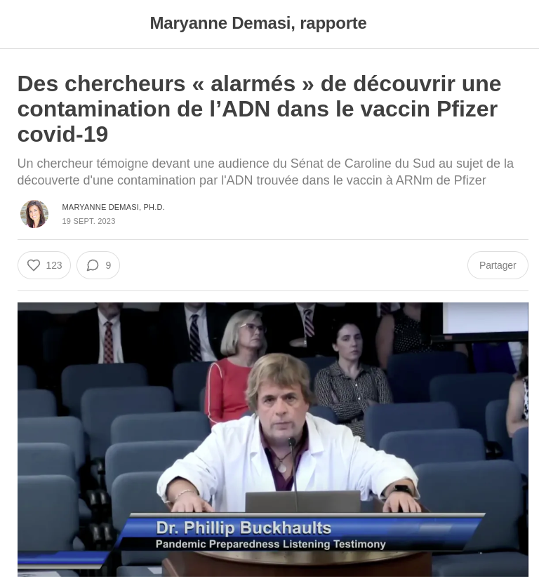 1/ "Le vaccin Pfizer est contaminé" "Il ne contient pas que de l'ARNm" "Il contient des morceaux d'ADN" "Cet ADN pourrait causer des effets graves" "Il est possible qu'il s'intègre dans l'ADN des cellules" "C'est un risque très réel de cancer futur" @P_J_Buckhaults au @SCSenate
