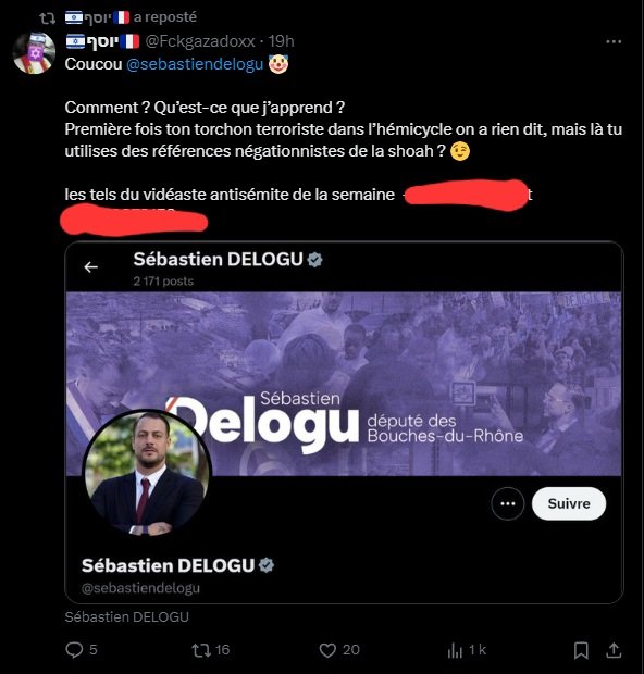 La binationalité : un pêché pour les #Musulmans, un droit naturel pour les #Juifs ? D'où vient ? Depuis plus d'un mois, nous sommes donc quotidiennement traités d'#antisémite parce que nous rappelons que, depuis 1967, #Israël viole sans relâche le droit international en occupant la #Palestine, que cette violation va croissante avec le développement de colonies, souvent illégales en droit israélien même, toujours illégales au regard du droit des nations. Nous rappelons que les humiliations subies par les #Palestiniens depuis 1967 sont un système mis en place par le suprémacisme juif pour inciter les Palestiniens à l'exil. Visiblement, certains #Juifs considèrent que le rappel du droit international, c'est de l'antisémitisme. De façon assez curieuse, leurs porte-parole, comme #Finkielkraut, #Zemmour et d'autres, soutiennent qu'appliquer la loi de tous à Israël, c'est haïr les Juifs, et nous voilà intimés de leur prouver que nous ne sommes pas nostalgiques du #nazisme ni d'#Auschwitz, en reconnaissant un droit spécial pour les Israéliens à massacrer des civils, femmes et enfants compris, à bombarder des hôpitaux, des ambulances, à détruire des maisons au bulldozer et à préparer le déplacement de 2 millions de personnes dans des conditions indignes. Je ne sais pas vous, mais moi, ce truc de culpabilisation du #goy, ça ne marche pas. Mon grand-père a été fusillé en 41 par les Allemands. Je n'ai rien à me reprocher dans cette tragédie, et le commerce permanent de la #Shoah me dégoûte. Il n'y a rien de plus indécent que d'entendre ces pleurnicheurs exiger de nous une dette éternelle pour des crimes qui sont vieux de 75 ans. Un moment donné, trop, c'est trop, et je suis personnellement favorable à ce que nous haussions le ton vis-à-vis de ceux qui nous prennent pour des idiots de #Goyim manipulables par le bout du nez. Qu'Israël appelle à la solidarité de l'Europe est une chose, qu'Israël nous insulte quotidiennement comme si nous, pauvres débiles, étions les paillassons d'un peuple élu, ça suffit. Que #Netanyahu s'immisce dans notre souveraineté nationale en rappelant Macron à l'ordre est inadmissible. Les partisans d'Israel diabolisent volontiers les #Musulmans qui affirment à haute voix que la France est un "pays de merde". Et ces propos sont intolérables. Mais que les #Juifs affirment que la France est un pays d'antisémites islamo-gauchistes est tout aussi scandaleux. Aujourd'hui, les Juifs de France doivent choisir leur pays. Soit ils sont Français, et il est urgent qu'ils arrêtent l'imposture du "antisioniste = antisémite", qu'ils se montrent respectueux des valeurs démocratiques et qu'ils soient tolérants vis-à-vis de ceux qui occupent cette terre depuis toujours. Soit ils considèrent que toute critique contre Israël est interdite au nom de la lutte contre l'antisémitisme et il faut qu'ils en tirent toutes les conséquences en termes de nationalité. Dans tous les cas, la France s'abaisse en se comportant comme le satellite d'un gouvernement étranger fanatique et partisan d'une théocratie étrangère à notre culture et à notre identité. La France ne peut exister que dans l'indépendance, pas dans la soumission à une communauté qui considère que son vrai pays est ailleurs.