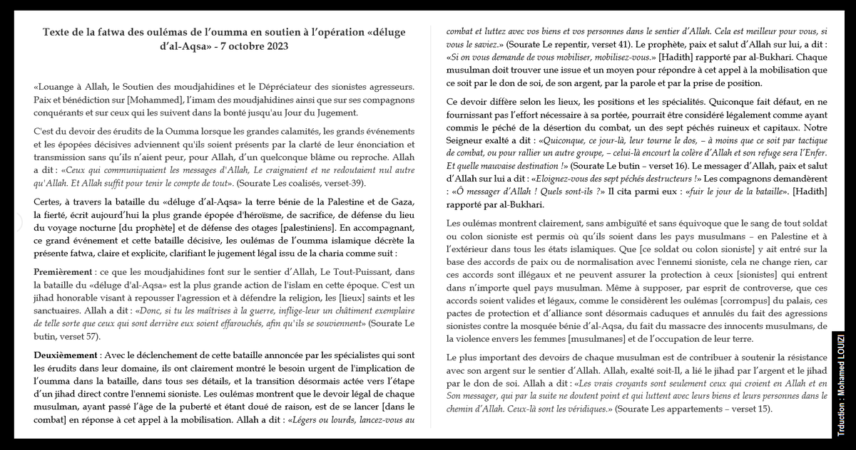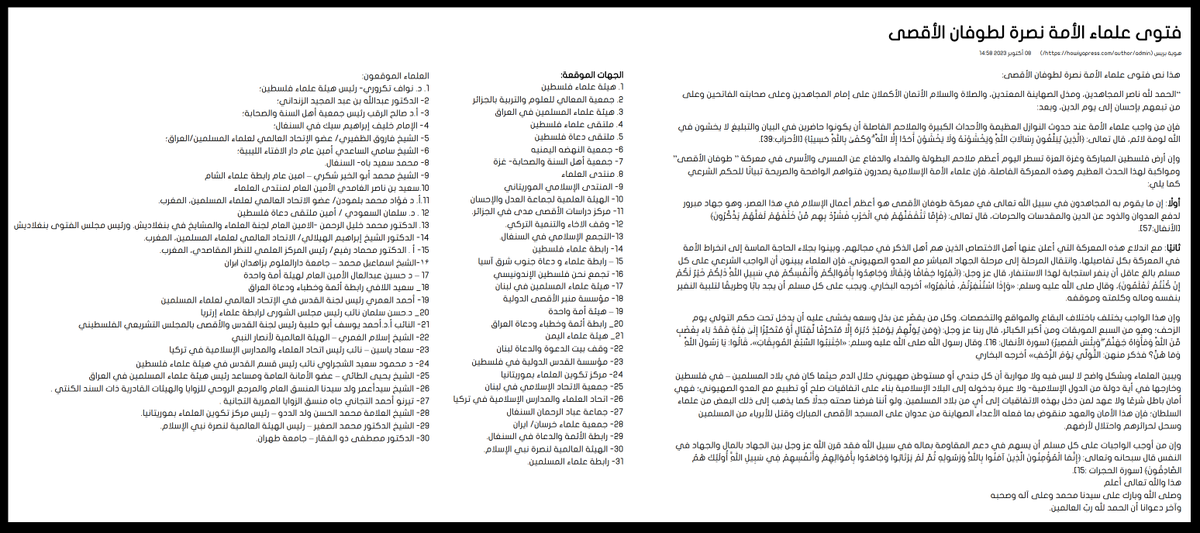 Vous trouverez ci-après le texte intégral de la fatwa en arabe ainsi que ma traduction. Dès le 8 octobre, cette fatwa a été diffusée des centaines voire des milliers de fois sur des sites en arabe et sur les réseaux sociaux de la frérosphère... 🔗https://palscholars.org/news/%D9%85%D9%84%D8%AA%D9%82%D9%89-%D8%B9%D9%84%D9%85%D8%A7%D8%A1-%D8%A7%D9%84%D8%A3%D9%85%D8%A9-%D9%86%D8%B5%D8%B1%D8%A9-%D9%84%D8%B7%D9%88%D9%81%D8%A7%D9%86-%D8%A7%D9%84%D8%A3%D9%82%D8%B5%D9%89/