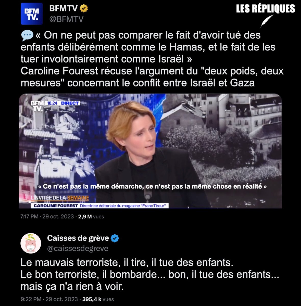 @Arcom_fr @GDarmanin Fourest, fidèle au racisme de la #Printanosphère, y va de sa comparaison des morts d'enfants. Pour elle, un enfant écrasé sous le mur de son immeuble était là au mauvais endroit au mauvais moment. Tout simplement. Des réactions ? Non, pire on la défend. https://x.com/Les_Repliques/status/1718903270469501375?s=20
