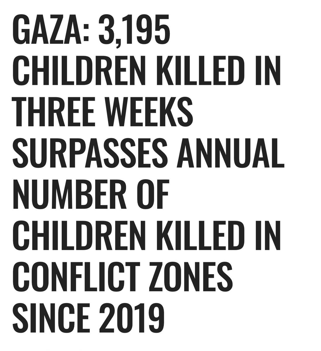 🔴 Le massacre des enfants Le nombre d'enfants tués au cours des trois dernières semaines à Gaza est supérieur au nombre annuel d'enfants tués dans les zones de conflit depuis 2019. Telle est la sinistre conclusion d'un rapport de l'organisation britannique Save the Children. 📍Source : https://www.savethechildren.net/news/gaza-3195-children-killed-three-weeks-surpasses-annual-number-children-killed-conflict-zones Depuis le 7 octobre, plus de 3 257 enfants ont été tués, dont au moins 3 195 à Gaza, 33 en Cisjordanie et 29 en Israël, selon Save the Children, citant les ministères de la santé de Gaza et d'Israël. Le nombre d'enfants tués en seulement trois semaines à Gaza est supérieur au nombre d'enfants tués dans des conflits armés dans le monde entier - dans plus de 20 pays - enregistré chaque année au cours des trois dernières années. Save the Children, fondée en Grande-Bretagne en 1919, indique également que sur les 7 703 personnes tuées à Gaza au cours des trois dernières semaines, plus de 40 % sont des enfants. Les enfants représentent également plus d'un tiers de tous les décès dans les territoires palestiniens et en Israël. Avec plus de 1 000 enfants portés disparus à Gaza, probablement sous des bâtiments effondrés, le nombre de morts risque d'être beaucoup plus élevé. Selon la même organisation, au moins 6 360 enfants ont été blessés à Gaza, ainsi qu'au moins 180 enfants en Cisjordanie et 74 enfants en Israël. Plus de 200 personnes, dont des enfants, sont toujours otages à Gaza. Le risque de décès des enfants blessés n'a jamais été aussi grand, affirme Save the Children. Selon les Nations unies, un tiers des hôpitaux de la bande de Gaza ne sont pas opérationnels en raison des coupures d'électricité et du "siège total" imposé par le gouvernement israélien, qui bloque l'entrée de produits essentiels tels que le carburant et les médicaments. Selon Médecins sans Frontières, le manque d'anesthésiques fait que les opérations chirurgicales sur les enfants, y compris les amputations, sont réalisées "à vif", sans aucune anesthésie. 📍Source : https://www.channel4.com/news/doctors-are-amputating-patient-children-without-anaesthesia-can-you-imagine-says-msf-coordinator-in-gaza