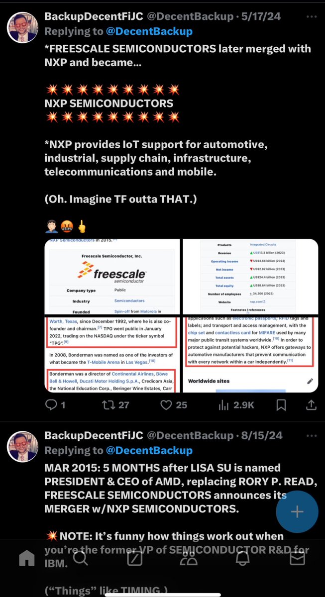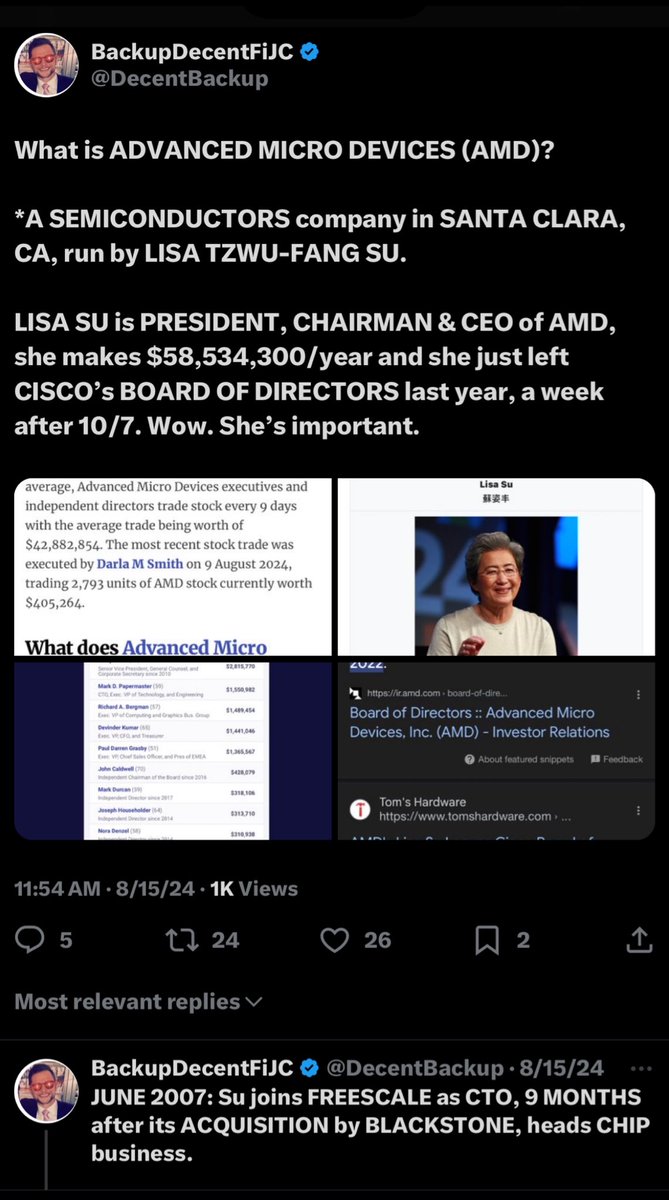 UPDATE: My God, folks. How could I POSSIBLY overlook arguably the MOST SCANDALOUS ONE OF ALL from this list? 👺ADVANCED MICRO DEVICES (AMD) Lol, that’s LISA SU, fam. She’s arguably the highest paid SEMICONDUCTOR ENGINEER and R&D in the WORLD, she’s the former VP of SEMICONDUCTOR RESEARCH at IBM and the COUSIN of HUANG over at NVIDIA. (Lisa Su, Chairman, President & CEO of AMD) LISA SU was sent to takeover at FREESCALE SEMICONDUCTORS as its CTO, just 9 MONTHS after BLACKSTONE ACQUIRED FREESCALE. *Su would leave FREESCALE a year outside of the “MH370 DISAPPEARANCE” where 20 FREESCALE EMPLOYEES were on-board and perished, to be named PRESIDENT & CEO of AMD, where she replaced RORY P. READ from BOOZ ALLEN HAMILTON. *5 months later, Freescale would merge with NXP SEMICONDUCTORS to create what we know today as ERICSSON. (TCI and GEMALTO were also involved here.) 👺FUN FACT: LISA SU joined the CISCO BOARD OF DIRECTORS in JANUARY 2020, and then later, she quietly STEPPED DOWN from the CISCO BOARD OF DIRECTORS on OCTOBER 13, 2023… just 6 DAYS AFTER THE “10/7 HAMAS ATTACKS”, folks. (What odd timing, I must say.😒🤦🏻♂️🤬)