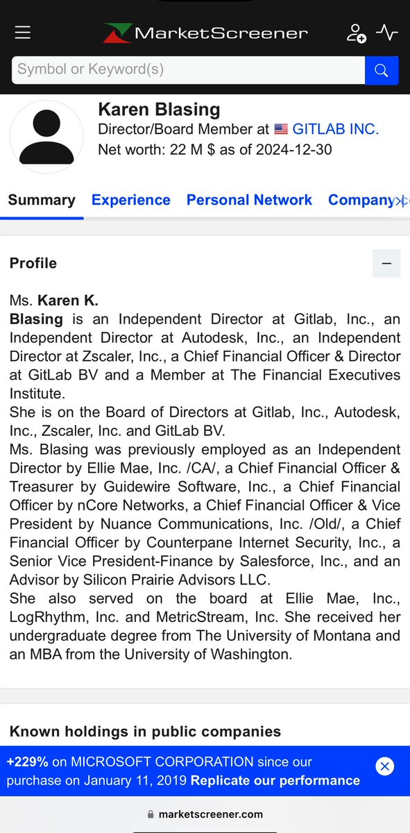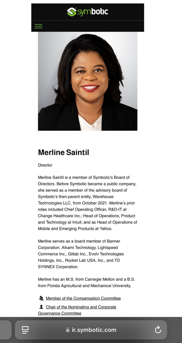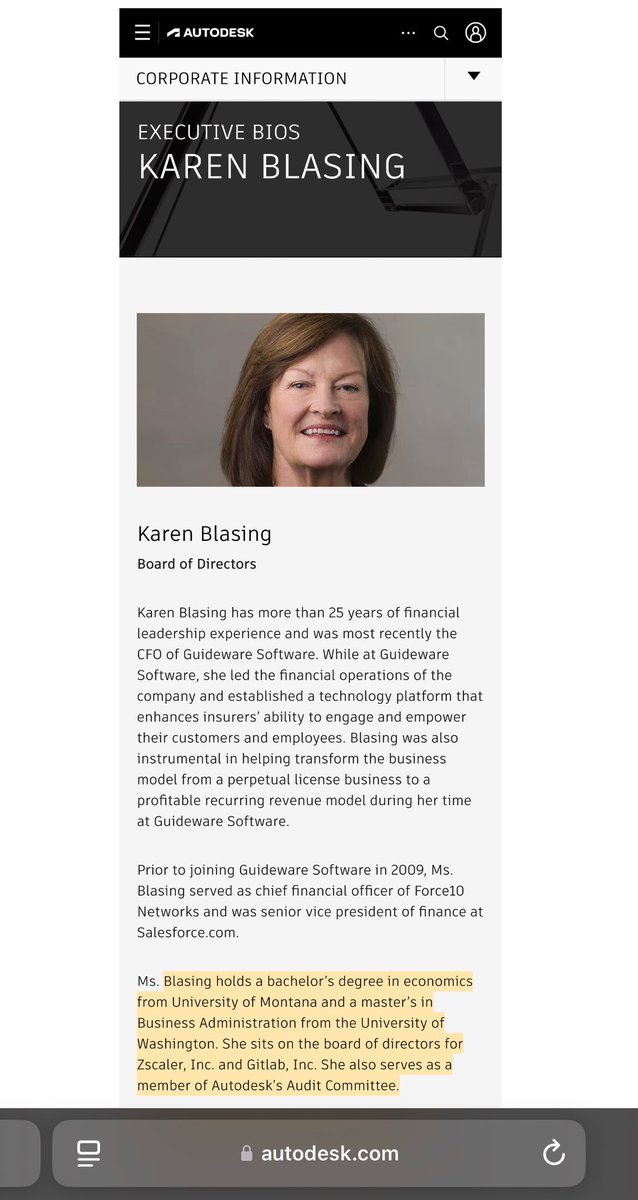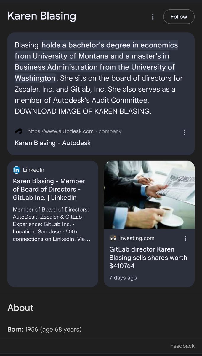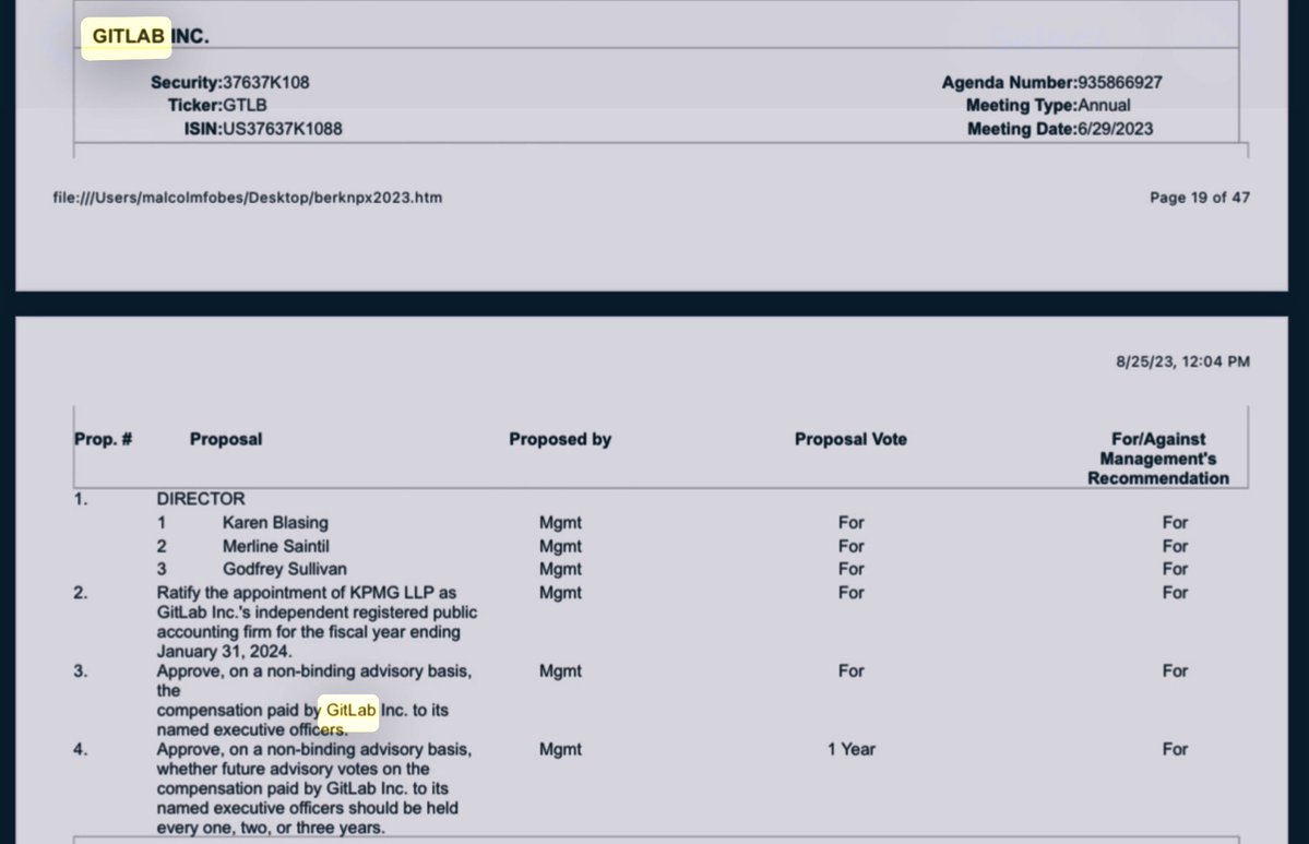 GITLAB INC: Some interesting Board of Directors members you guys added in June/July of 2023. (You guys love Autodesk for some reason.) ✅GODFREY SULLIVAN *CROWDSTRIKE, Director *THOUSANDEYES INC, Director *PROMPTU SYSTEMS CORP, CEO *SPLUNK INC, Director, President & CEO *HYPERION SOLUTIONS, President & CEO *CITRIX SYSTEMS, Director *AUTODESK, EVP & President of Discrete Division *APPLE, VP of Channels *MARQETA INC, Director *http://PEOPLE.AI, Director *INFORMATICA CORPORATION, Director *RINGCENTRAL INC, Director ✅KAREN BLASING *Z SCALER (Unit 8200), Director *SALESFORCE, Senior VP of Finance *ELLIE MAE, Director *AUTODESK, Director *NUANCE COMMUNICATIONS, CFO *COUNTERPANE INTERNET SECURITY, CFO *INFORMIX CORPORATION (IBM Informix), Sr Finance Exec *ORACLE, Sr Finance Exec *GUIDEWARE SOFTWARE INC, CFO *FORCE10 NETWORKS, CFO ✅MERLINE SAINTIL *SYMBOTIC, Director, Chair of Nomimating and Governance Committees & Member of Compensation Committee *WAREHOUSE TECHNOLOGIES (Symbotic parent company), Advisory Board *CHANGE HEALTHCARE INC, COO, R&D-IT *INTUIT, Head of Operations, Product & Technology *YAHOO! (Apollo), Head of Operations, Mobile & Emerging Products *BANNER CORPORATION, Director *ALKAMI TECHNOLOGY, Director *LIGHTSPEED COMMERCE INC, Director *EVOLV TECHNOLOGIES HOLDINGS, Director *ROCKET LAB USA, Director *TD SYNNEX CORPORATION, Director *ADOBE *PAYPAL (Chabad) *SUN MICROSYSTEMS (Kleiner Perkins) *CARNEGIE MELLON