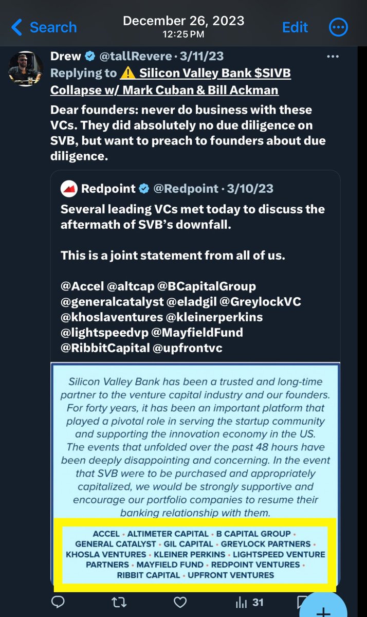 @_KrisHunter_ @WethePeopleAZA1 @AzPinkLady @JoshMerrittTX @PatrickByrne @KariLakeWarRoom @BlehmLawAZ @KevinMoncla @ParikhClay @AZDesert_Rose @Theonlyme333 @DakotaSidwell @TxSaving @AbrahamHamadeh @merissahansen17 @WaysandMeansGOP Interesting you’d ask such a pertinent question about SILICON VALLEY BANK at times like this! Immediately after SVB’s “collapse”, their 14 PORTFOLIO COMPANIES issued a JOINT STATEMENT SUPPORTING SVB, including: ✅KLEINER PERKINS ✅LIGHTSPEED VENTURE PARTNERS ✅GREYLOCK PARTNERS https://t.co/bd9Y3SAK6P