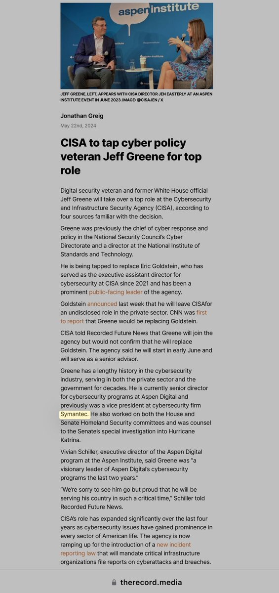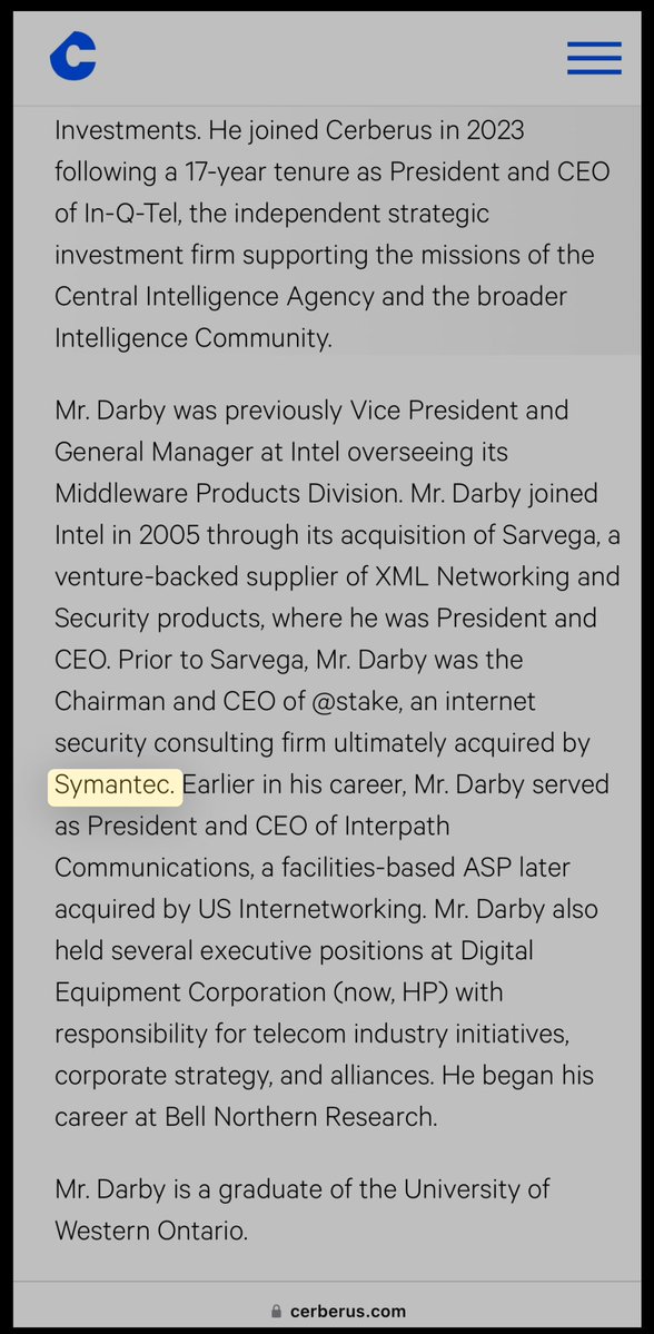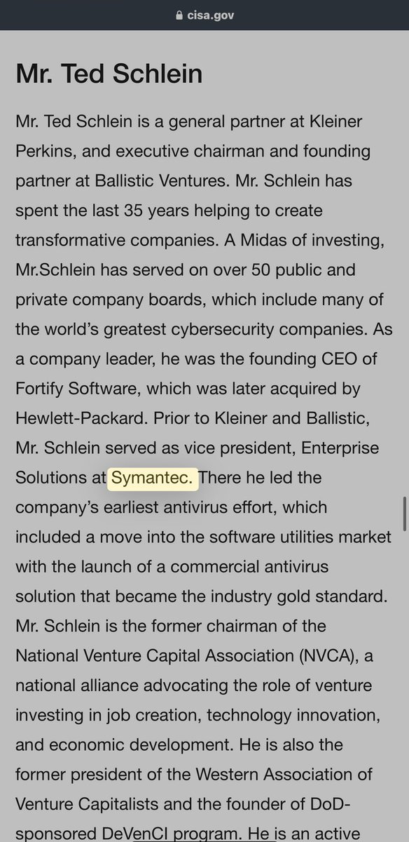 Probably pretty close, considering SCHLEIN was VP of ENTERPRISE SOLUTIONS at SYMANTEC, when it acquired @stake… whose CHAIRMAN & CEO was literally CHRIS DARBY, the recently “retired” PRESIDENT & CEO of IN-Q-TEL. *Hey, CISA just hired JEFF GREENE, also SYMANTEC, to its top role! https://t.co/y7qEmCFS7W