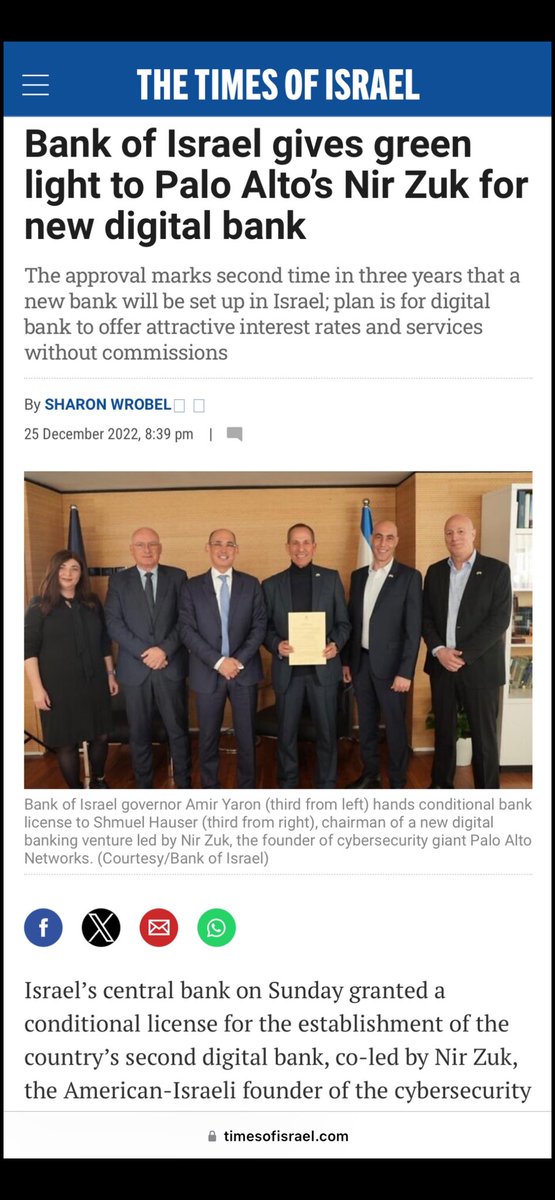 7. Oh btw, on CHRISTMAS DAY 2022, ONE MONTH AFTER THE STOLEN NOVEMBER 2022 AZ MIDTERM ELECTIONS, the BANK OF ISRAEL actually gave NIR ZUK and PALO ALTO NETWORKS the GREEN LIGHT to set up just the 2ND NEW BANK in ISRAEL in 40 YEARS. But WHY? Likely REWARD for a stolen election?😒 https://t.co/lTaSbfUJuN
