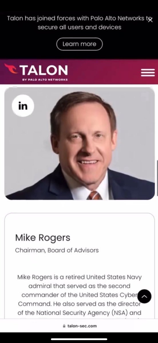 2. Retired U.S. NAVY ADMIRAL and former NSA DIRECTOR, MIKE ROGERS, is CHAIRMAN of TALON. (He’s the TOP DAWG at the PENTAGON.) 3. TALON was acquired by PALO ALTO NETWORKS for $625,000,000. The acquisition was announced EXACTLY ONE MONTH after the 10/7 “HAMAS attack”. (Cont’d.)
