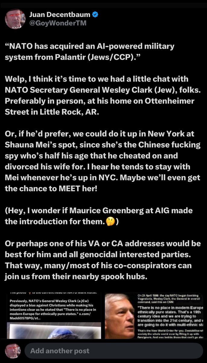 PALANTIR ISRAEL Remember that time Carbyne and Palantir partnered with IDF Unit 8200, Michael Chertoff, Ehud Barak, Jeffrey Epstein and the NSA to put Jewish backdoors into all our major digital systems and cyber infrastructure so Israel and the CIA could go on raping kids, blackmailing politicians and stealing America’s fucking elections to avoid accountability and send Israel gorillions of our tax dollars every year? And how it was done thanks to the efforts of HAMUTAL MERIDOR, the head of PALANTIR ISRAEL, who’d been HIRED BY THE NSA at VERINT to do exactly that? And then AIPAC (Mossad) NATIONAL POLITICAL DIRECTOR and JFNA (Mossad) TRUSTEE YEHUDA NEUBERGER had his wife, ANNE NEUBERGER, installed as NSA CYBER DIRECTOR, while TEAM8/TALON/LEUMI made sure they bought off NSA DIRECTOR, MIKE ROGERS? And then 9/11 co-conspirator and FEMA terrorist MICHAEL CHERTOFF threw Mike Rogers on the Issue One “National Council on Election Integrity” to work alongside himself and NATO Supreme Commander General Wesley Clark, so they could be all “Israel dindu nuffin!” as they were stealing our fucking elections and protecting pedophiles? And then Wesley Clark and NATO just partnered up with Palantir and bought some AI-based military weapons systems? Good times, folks. Good times.