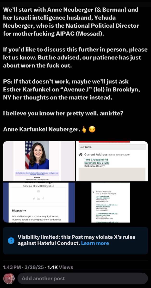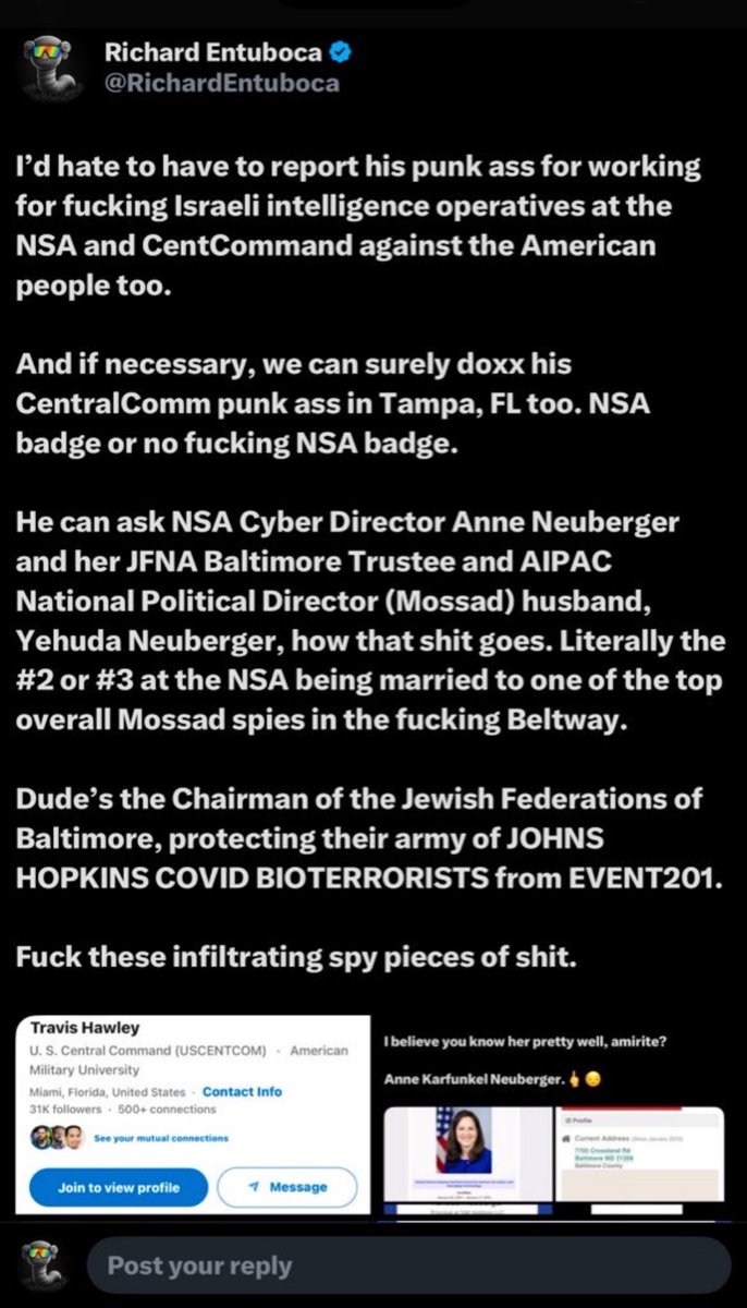 *PALANTIR UPDATE* 🚨Yeah, as it turns out, Ginkgo Bioworks (Palantir) was working directly with Johns Hopkins University AND the Chinese Communist Party during their joint Event 201 planning sessions this whole time. *Remember how Alvin Krongard, Michael Bloomberg and David Rubenstein run Johns Hopkins University, and that it’s a big front for Soviet Union Jewry terrorists like Avril Haines and Eric Schmidt, whose father has a Distinguished Professorship named after him at the JHU School of Advanced International Studies (SAIS)? *And how it was the JHU SAIS who created the “there was no virus” horseshit that dozens of “TwitterX COVID truthooors” push on this god-forsaken platform in order to ATTEMPT to absolve Johns Hopkins University, Stanford University, UC-Berkeley, Duke University, Columbia University, UNC-Chapel Hill, UPenn and the Jewish Federations of North America (UJA/Mossad) of being CLEARLY guilty of bioterrorism and genocide? Because if there’s NO VIRUS, there’s NO MURDER WEAPON in the form of an ETHNICALLY-CALIBRATED SARS-COV-2 CORONAVIRUS that was deliberately CREATED, RELEASED AND COVERED UP BY JEWS and the CCP, amirite? 🚨“Event 201 — Let’s war-game the COVID bioweapon we’re about to release against Whites who we blame for the HoLoCaUsT but never bothered to say ‘thank you’ for their having sacrificed TENS OF MILLIONS OF THEIR LIVES to save us from Big Bad Mr. H because ‘NeVeR aGaIn Is NoW!’ and stuff.” 🚨And THEN they “dropped the ball” by covering up HCQ efficacy and hiding Remdesivir’s efficacy. 🚨But oddly enough, they didn’t have ANY problems with their CHINESE BUSINESS PARTNERS across the pond SWITCHING FROM using CLEARLY TOXIC REMDESIVIR to USING CLEARLY EFFECTIVE HCQ TO TREAT COVID WITH INCREDIBLE SUCCESS. No, no… that’s just NOT ACCEPTABLE for the HUNDREDS OF MILLIONS OF WHITE, NON-JEW AMERICANS. We couldn’t POSSIBLY have that, amirite? Fa***ts. Enjoy your downfall. We will.🖕 🚨PS: Thank God JHU is in Baltimore, because we could all go visit JHU and NSA Cyber Director Anne Neuberger AND her husband, AIPAC National Political Director and Trustee of JFNA Baltimore, without having to make multiple trips to various cities. I think we should do that, but only AFTER we’ve doxxed everyone involved. Hell, we could even stop by 17th Street and visit Dorothy Tananbaum (UJA) and Jacob Baime (AIPAC) over at ICC and discuss the coordinated doxx/destroy livelihoods operation they have running with Liora Rez, Adam Milstein, Unit 8200, Canary Mission, Shirion Collective, AwesomeJew, Friends of the IDF and AG Pam Bondi to protect the aforementioned heinous fa***ts above without even having to leave the Beltway.