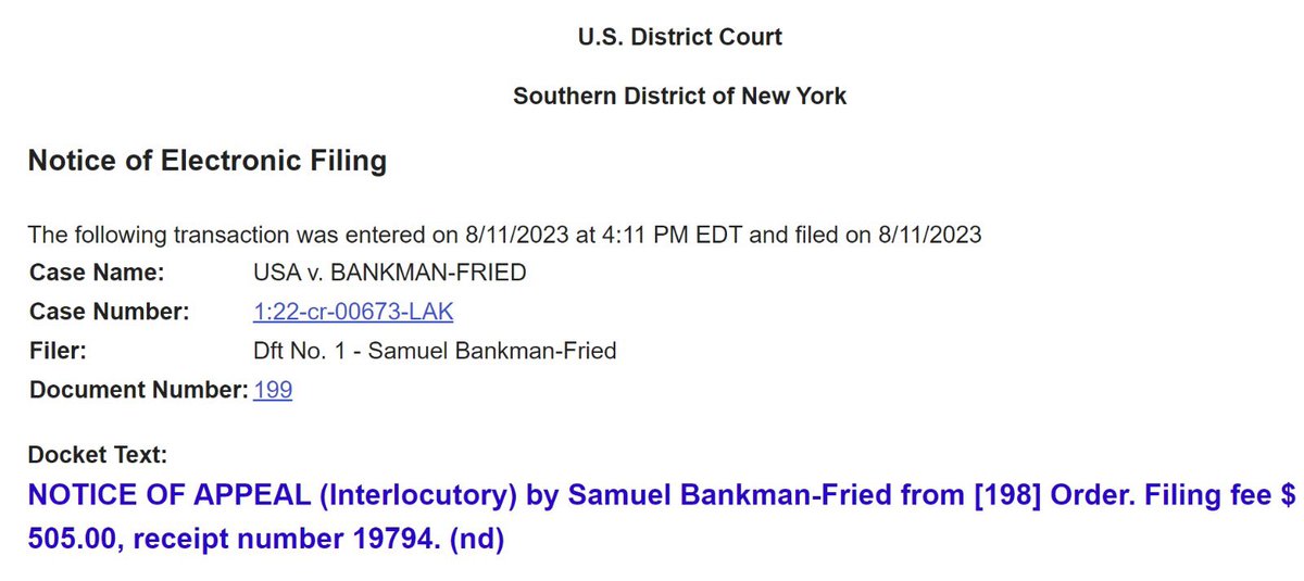 🚨BREAKING: SBF LAWYERS FILED AN APPEAL An appeal against the remand to jail has been filed less than an hour after SBF was handcuffed and led away by US Marshals. https://t.co/vAlwtf64J0