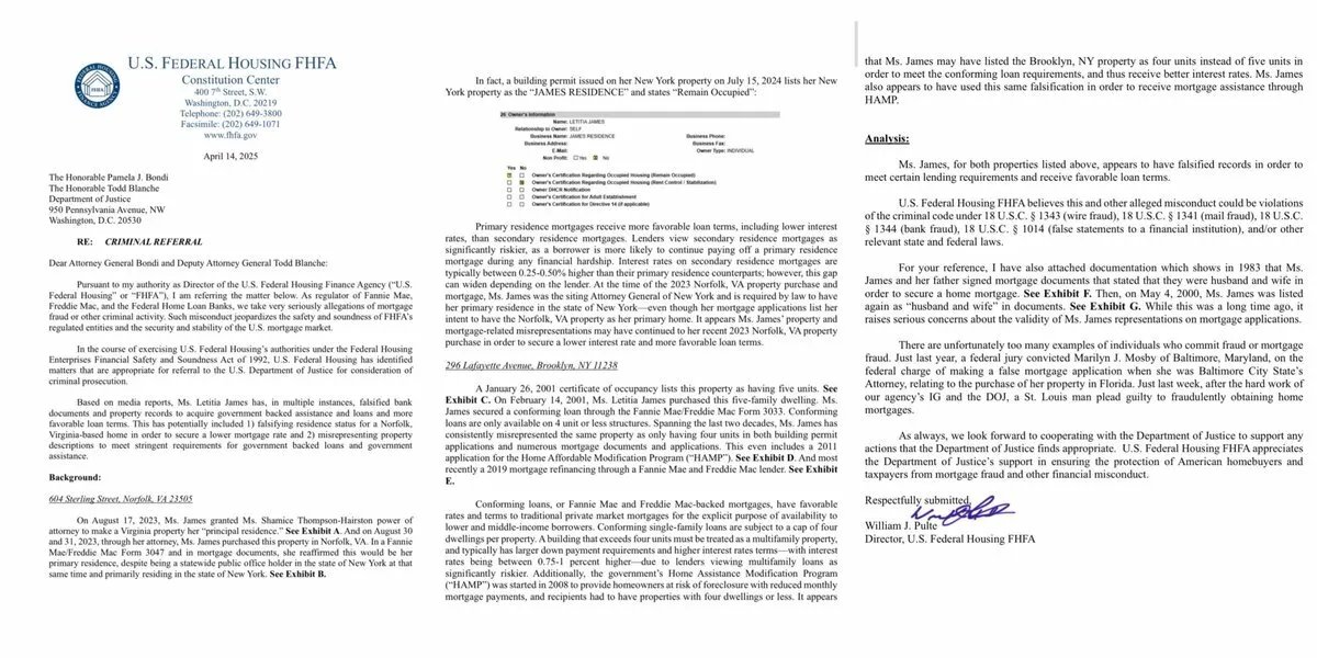 🚨🇺🇸 LETITIA JAMES' MORTGAGE NIGHTMARE: FEDS REFER NY'S TOP PROSECUTOR TO DOJ Federal Housing Director William Pulte formally refers NY Attorney General Letitia James to Justice Department for criminal investigation over alleged mortgage fraud. FHFA letter claims James falsified documents to secure favorable loan terms while representing Virginia property as her "principal residence" despite serving as NY elected official. The prosecutor who's made a career of investigating others' financial dealings now faces scrutiny of her own mortgage applications. Source: @alx @nicksortor