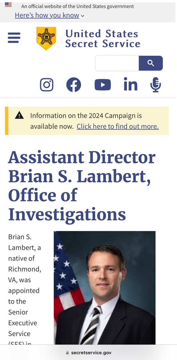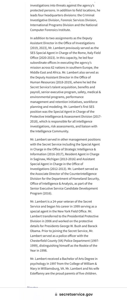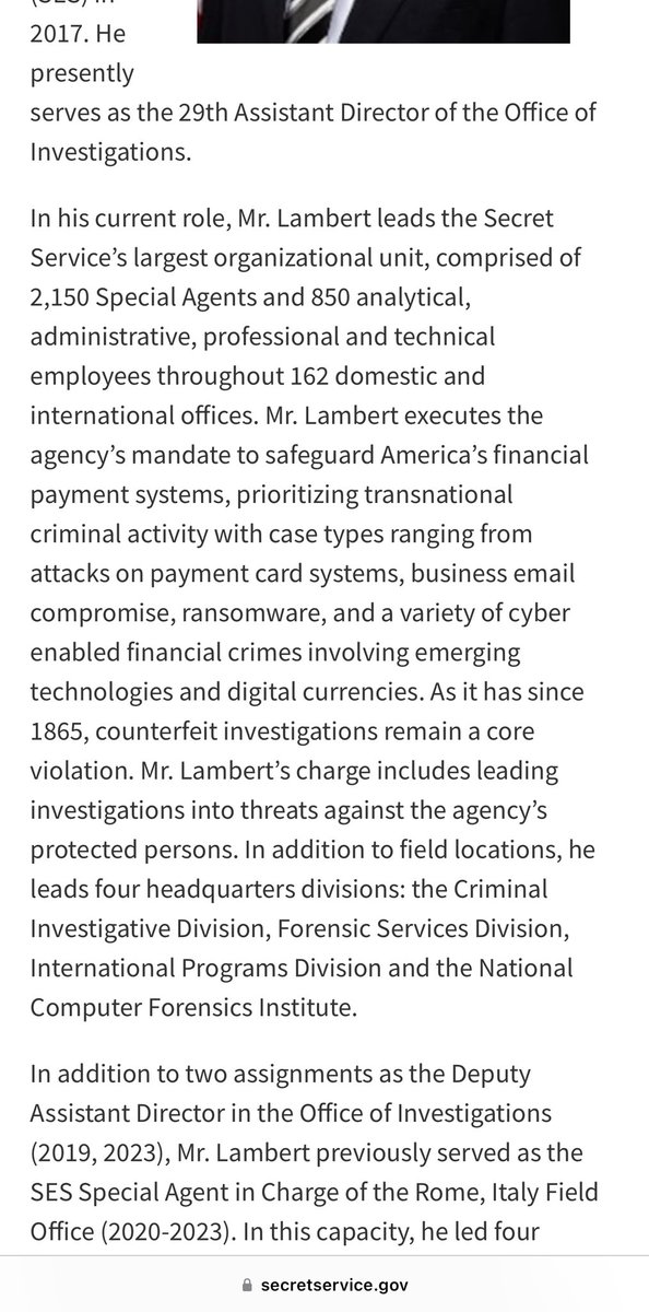 ✅Brian S. Lambert *The U.S. SS ASSISTANT DIRECTOR for the OFFICE OF INVESTIGATIONS started his career in 1999 in the NEW YORK FIELD OFFICE. *Served as ASSOCIATE DIRECTOR of COUNTERINTELLIGENCE for DHS and on the PROTECTIVE DETAILS of GEORGE W. BUSH and BARACK OBAMA.