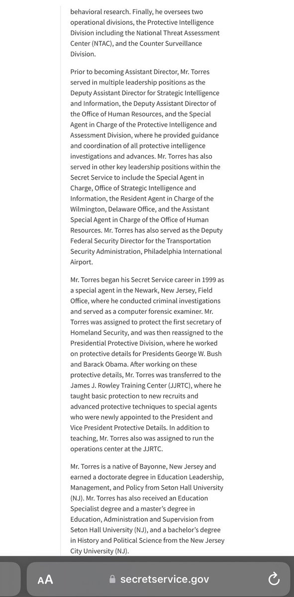 ✅David M. Torres *ASSISTANT DIRECTOR in the OFFICE OF STRATEGIC INTELLIGENCE AND INFORMATION, and served on PROTECTIVE DETAIL for PRESIDENTS GEORGE W. BUSH and BARACK OBAMA. *Led the WILMINGTON, DELAWARE FIELD OFFICE as the RESIDENT AGENT IN CHARGE.