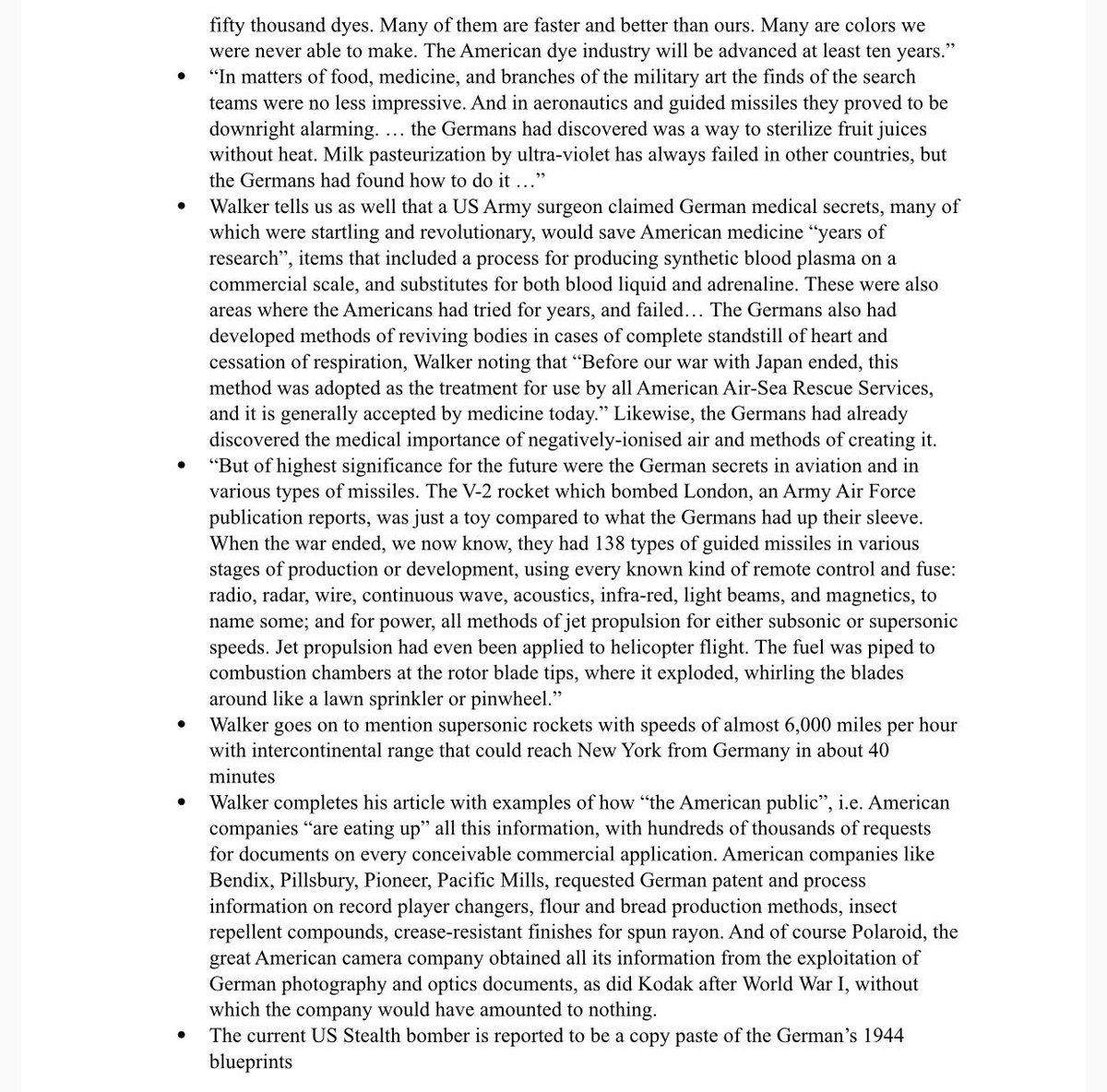 Every tech advancement you've ever seen likely comes from the Germans. It is reported that our current stealth bomber is a copy paste of their 1944 blueprints. They had working models of night vision scopes, guided missiles, and science we didn't even know existed in the 1940s.⬇️