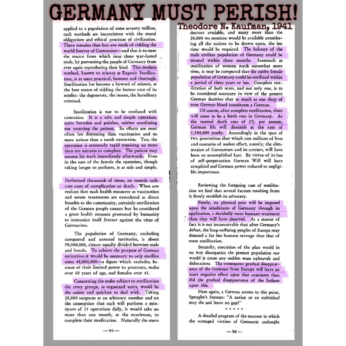 Kaufman goes so far as to demand the complete genocide of Germany, as well as the Eugenic Sterilization of any remaining survivors so that Germany could never again reach the heights it once had. Pure evil, and his book is almost exactly what the US did.