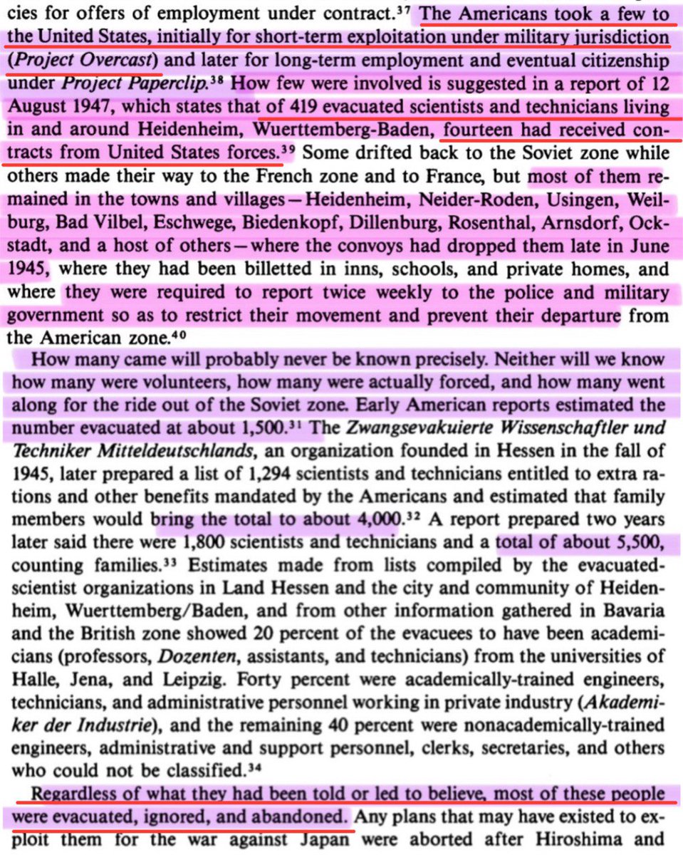 What we have come to know as Operation Paperclip is a bundle of lies/half truths in which you are made to believe that 1,000s of "Nazis" occupy key positions in the US. Out of 1500 German scientists captured, almost 99% were executed or abandoned in 3rd World Countries.