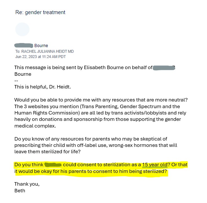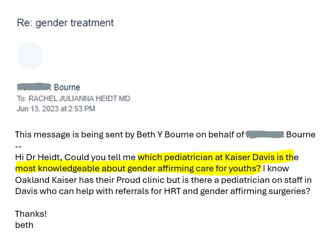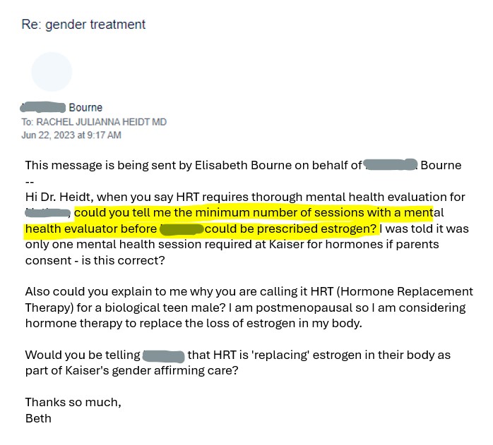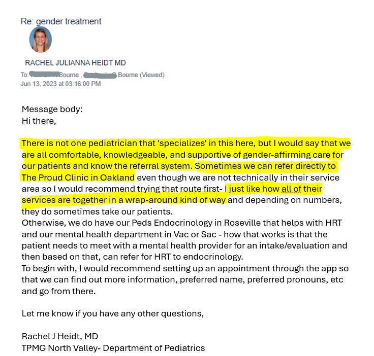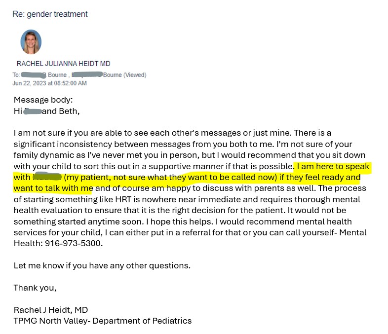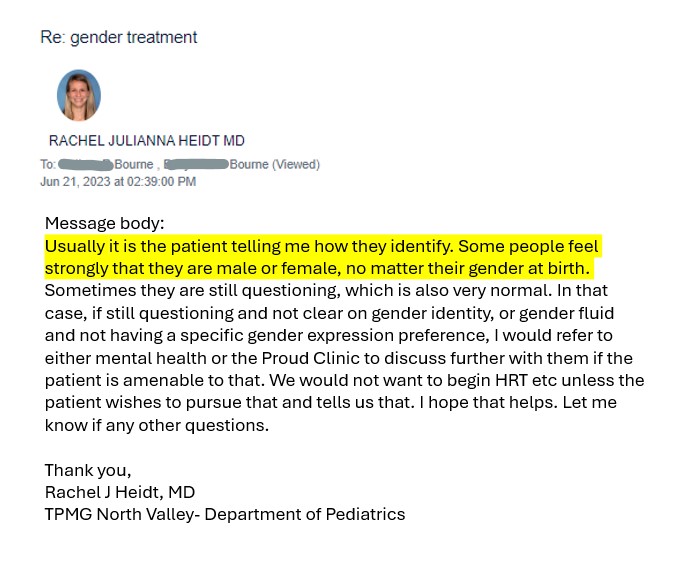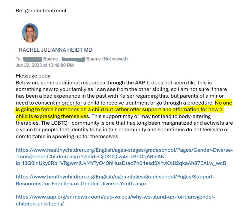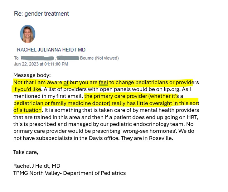 12/12 And here it is, the proof. The Kaiser Permanente pediatricians will take no responsibility or blame for the destruction (cancer risks, sterility, irreversible genital surgeries, etc.) to your child. Dr. Heidt says: "As I mentioned in my first email, the primary care provider (whether it's a pediatrician or family medicine doctor) really has little oversight in this sort of situation." It's a big money $$$ generating pipeline for confused kids 🏳️⚧️🏳️⚧️ as Kaiser is an HMO, so both the insurer and the provider. All of the Kaiser members are paying the shared cost of putting these kids on wrong sex hormones, needing fertility banks, providing cosmetic double mastectomies for teen girls, etc. It's the most horrific medical scandal of modern times.