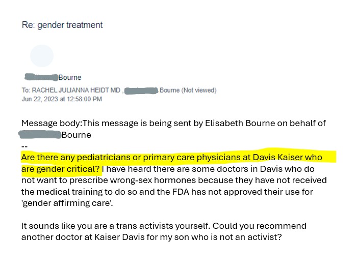 I wanted proof to show the world there was almost no stopping a trans-identified child from being medically "transitioned" at Kaiser Permanente once your child announced their trans 🏳️⚧️ identity. I wanted written records from the pediatricians in my town (Davis, CA) exactly what would be their protocol for medicalizing a child, and if there were any guardrails in place for parents like me who were not affirming. In order to do this, I pretended my younger child, my 15-year-old son, was interested in starting up on estrogen so he could present as female. Unlike his sister, my son had never experienced any distress over "gender" and wasn't likely to ever see this correspondence between his new pediatrician and me. Within 2 days, I received all the proof I needed to show how every pediatrician was completely captured by radical gender ideology and no child was safe under Kaiser's care. The responses get more shocking as I ask harder questions 🧵 @aboutKP@LeorSapir @wesyang @Miriam_Grossman @SwipeWright@shellenberger @benryanwriter @ErinFriday75490 @jessesingal@donoharm