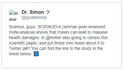 18/ 𝗘𝗫𝗔𝗠𝗣𝗟𝗘 𝗢𝗡𝗘: I referred to this publication (https://www.mdpi.com/1660-4601/18/8/4344), which has been peer-reviewed. Twitter banned me for doing so for one week for "Violating the policy on spreading misleading and potentially harmful information related to COVID-19.".