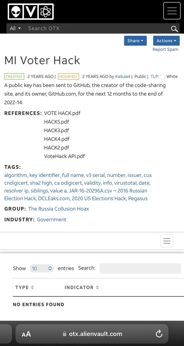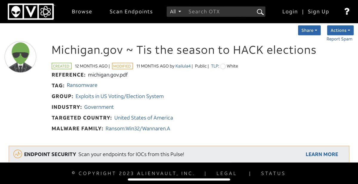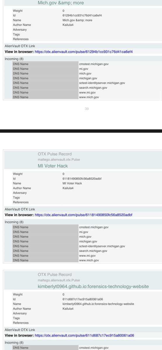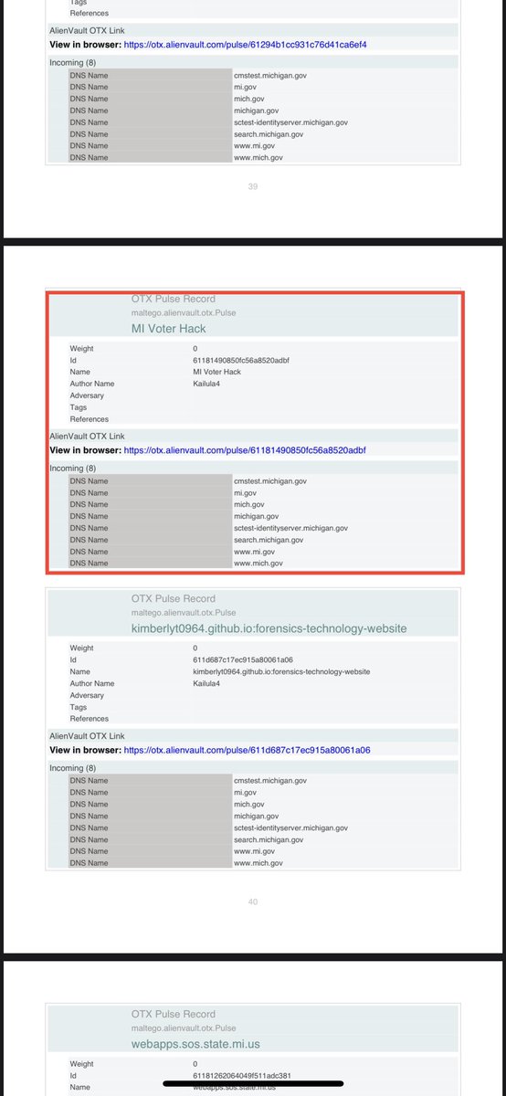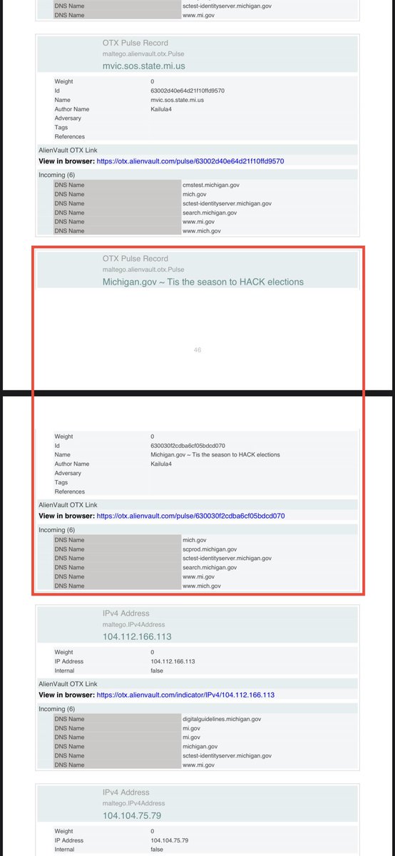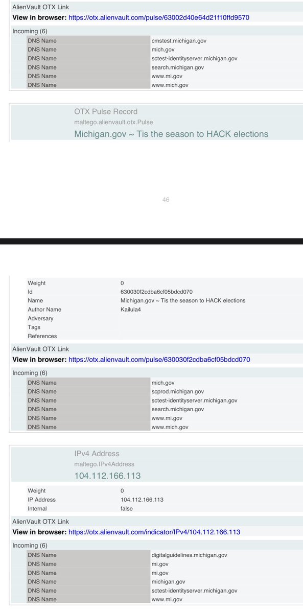 Here are those respective AlienVault links. 👽Tis the season to HACK elections: https://otx.alienvault.com/pulse/630030f2cdba6cf05bdcd070 👽MI Voter Hack: https://otx.alienvault.com/pulse/61181490850fc56a8520adbf
