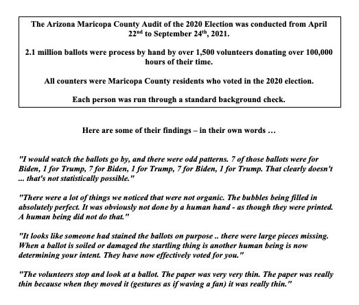 And here it is, The Arizona Senate AUDIT CONFIRMS beyond the shadow of a doubt Trump is the legitimate President of the 2020 Presidential election, Katie Hobbs inserted 74, 243 MAIL IN BALLOTS in the Nov 3, 2020 election that are TIED to individuals returned and cast with NO RECORD of ever being SENT OUT. 📝U.S. Congress certified a criminal enterprise on Jan 6. And they all know it,