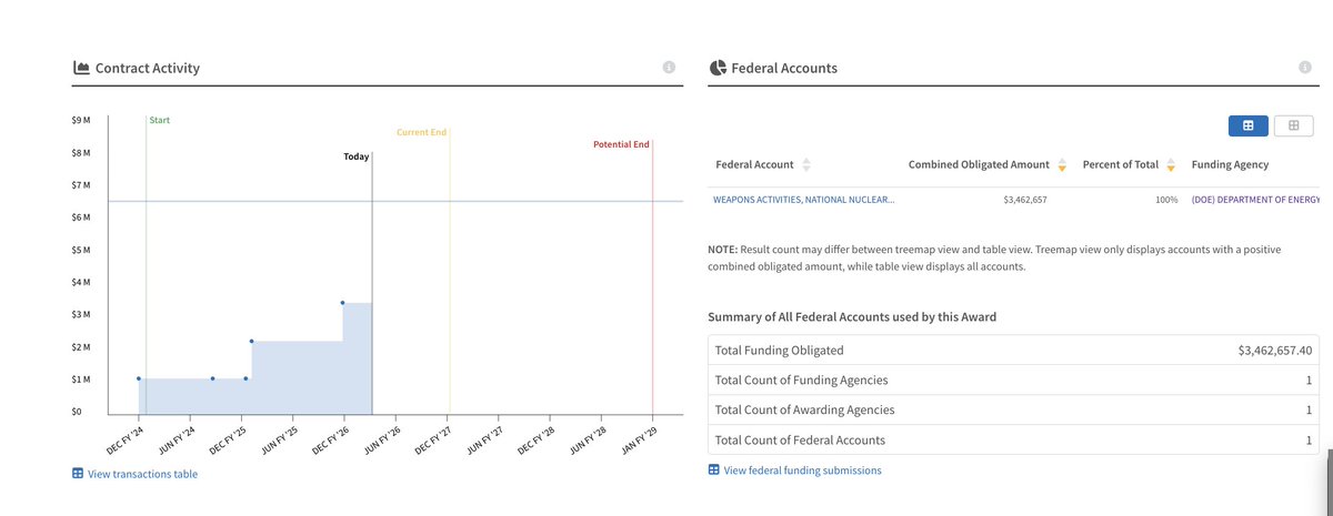 Five contracts. His awards are still active, and he's using language of overthrow in regards to President Trump? $8.55M — "Technical Support" (CONT_AWD_89303026FET400040_8900_89303025DET000003_8900) $4.42M — "Transition Services" (CONT_AWD_89303025FET400037_8900_89303025DET000003_8900) $4.39M — "Service Contract" (CONT_AWD_89303018CET000003_8900_-NONE-_-NONE-) $3.50M — "Vulnerability Assessment" (CONT_AWD_89303024CET000021_8900_-NONE-_-NONE-) $3.46M — "NNSA Assessments" (CONT_AWD_89233124CNA000331_8900_-NONE-_-NONE-)