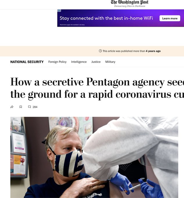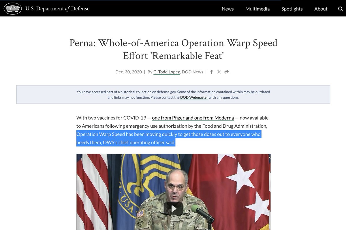 (5/9) Army Genral Gus Perna was the Chief Operation Officer of Operation Warp Speed. DARPA, the Defense Advanced Research Projects Agency, developed the tech for the COVID injections starting more than a decade prior to 2020. Source: https://www.defense.gov/News/News-Stories/Article/article/2459464/perna-whole-of-america-operation-warp-speed-effort-remarkable-feat/ Source: https://www.washingtonpost.com/national-security/how-a-secretive-pentagon-agency-seeded-the-ground-for-a-rapid-coronavirus-cure/2020/07/30/ad1853c4-c778-11ea-a9d3-74640f25b953_story.html