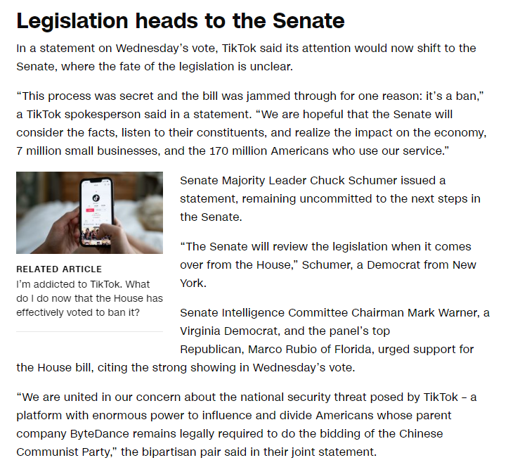 The House of Representatives just rubber stamped the TikTok ban bill with a vote of 356-92. It's now moving on to the senate floor. https://t.co/7Cpa0vWijz
