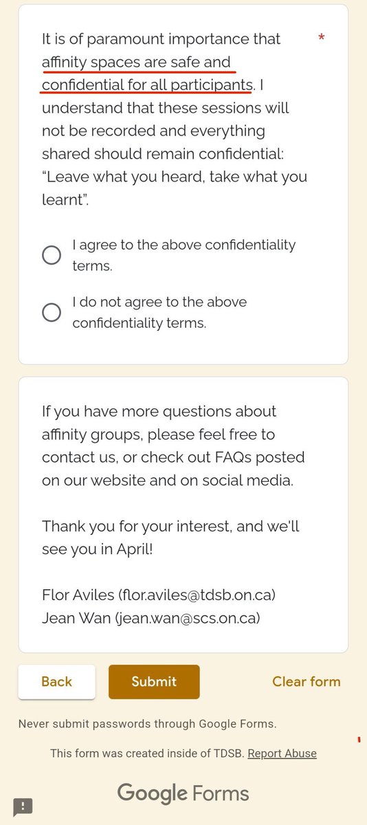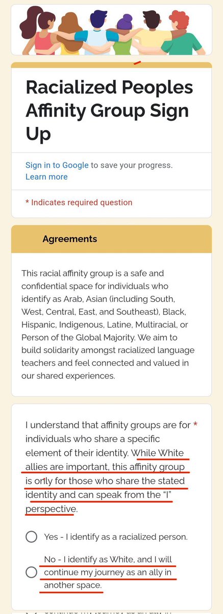 “White allies” are not welcome to join this “safe and confidential” “affinity space” taking place at the Ontario Modern Language Teachers’ Association conference this Fri/Sat in Toronto. If you “identify as White,” you can “continue [your] journey as an ally in another space.” This is what racism looks like.