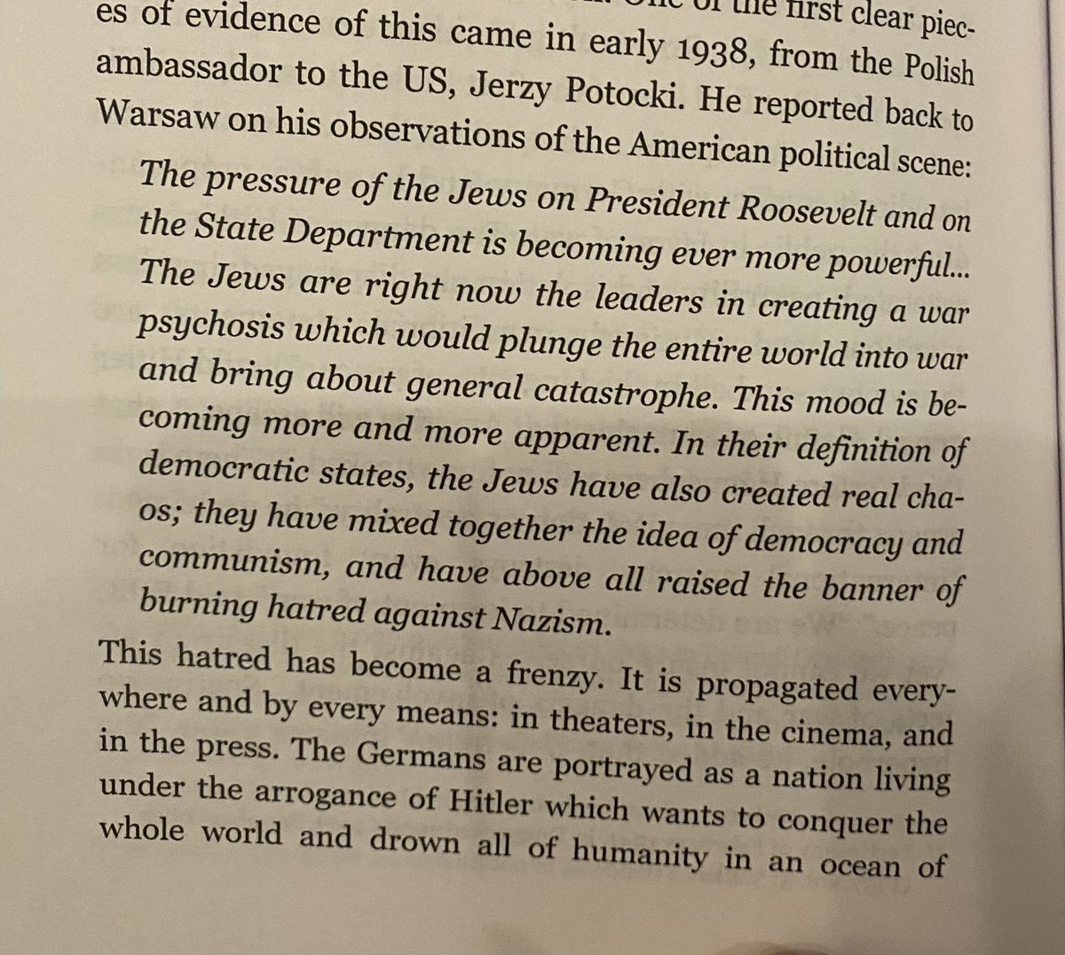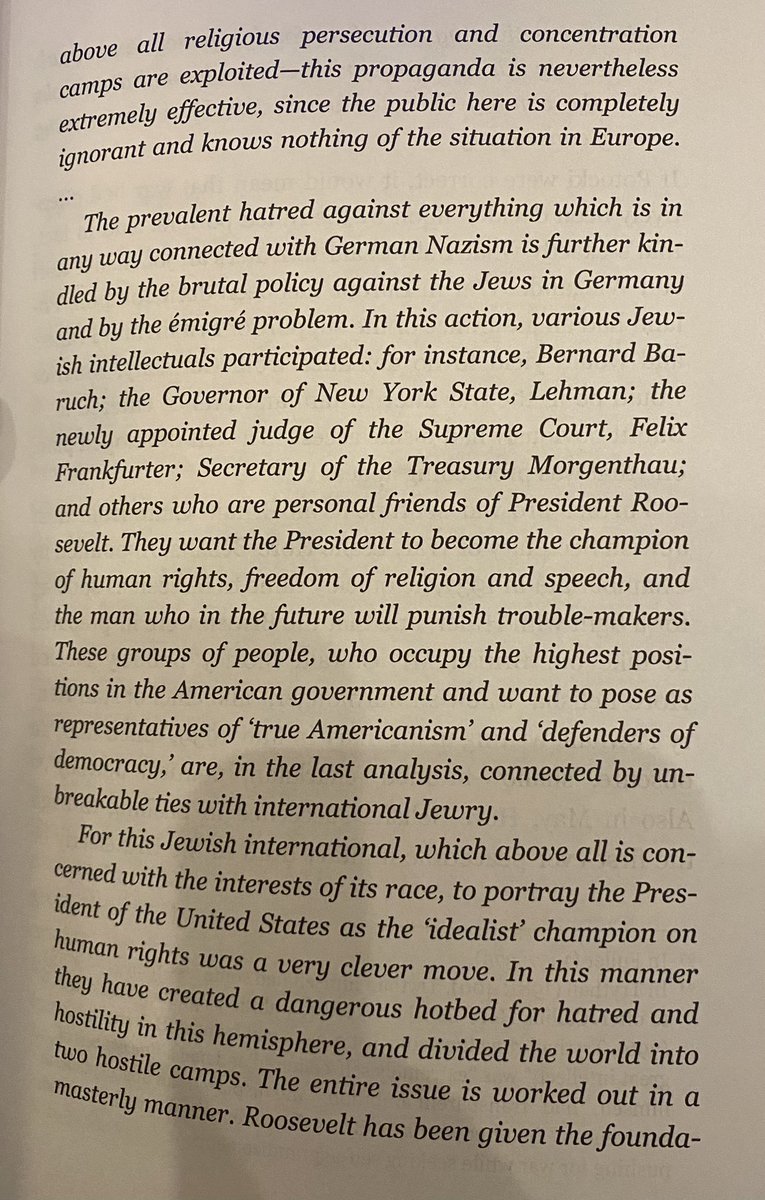 While the US wished to remain isolationist, and had a large amount of pro German sentiment as well, Roosevelt did his best to tip toe around war, and never openly advocate for it. This however was mostly a facade. Roosevelt clearly was looking for a way to get into the war, and he did assist the Allies early on even while giving the image of being “neutral.” The Jewish influence on Roosevelt and his administration was immense. Some of the influential Jews that helped Roosevelt destroy the idea of the US with the New deal were Louis Brandeis, Felix Frankfurter, Henry Morganthau jr., Sam Rosenman and Ben Cohen. FDR also had long standing financial and vocal support from his days as New York Governor. Some of the best early evidence on the American Jews and their influence leading America into World war 2 come from polish diplomat Jerzy Potocki. “The pressure of the News on president Roosevelt and the state department is becoming ever more powerful.” 🧵 15/19