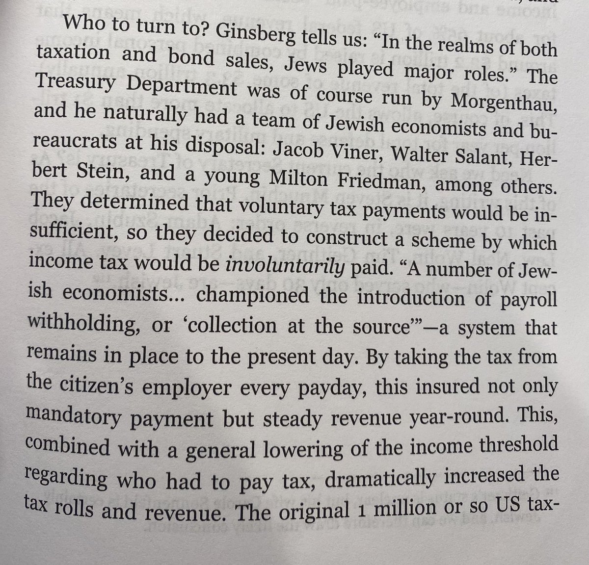 What other things did the Roosevelt administration and American Jews do to get us into the war? For starters the Lend-lease act of 1941, which allowed us to help allied nations without officially entering the war. Secondly Jewish controlled Hollywood went into overdrive to produce some anti Nazi films. There was even a letter written from the Jewish “Warner Brothers” Jack And Harry Warner to Roosevelt that “they would do all within their power” to show the worthiness of the cause for war in Europe. It should also be noted that once the war started the revenue that needed to be raised was immense. Never fear, a team of Jewish economists designed a new scheme to tax many more Americans and automatically take it from their checks…. 🧵 16/19