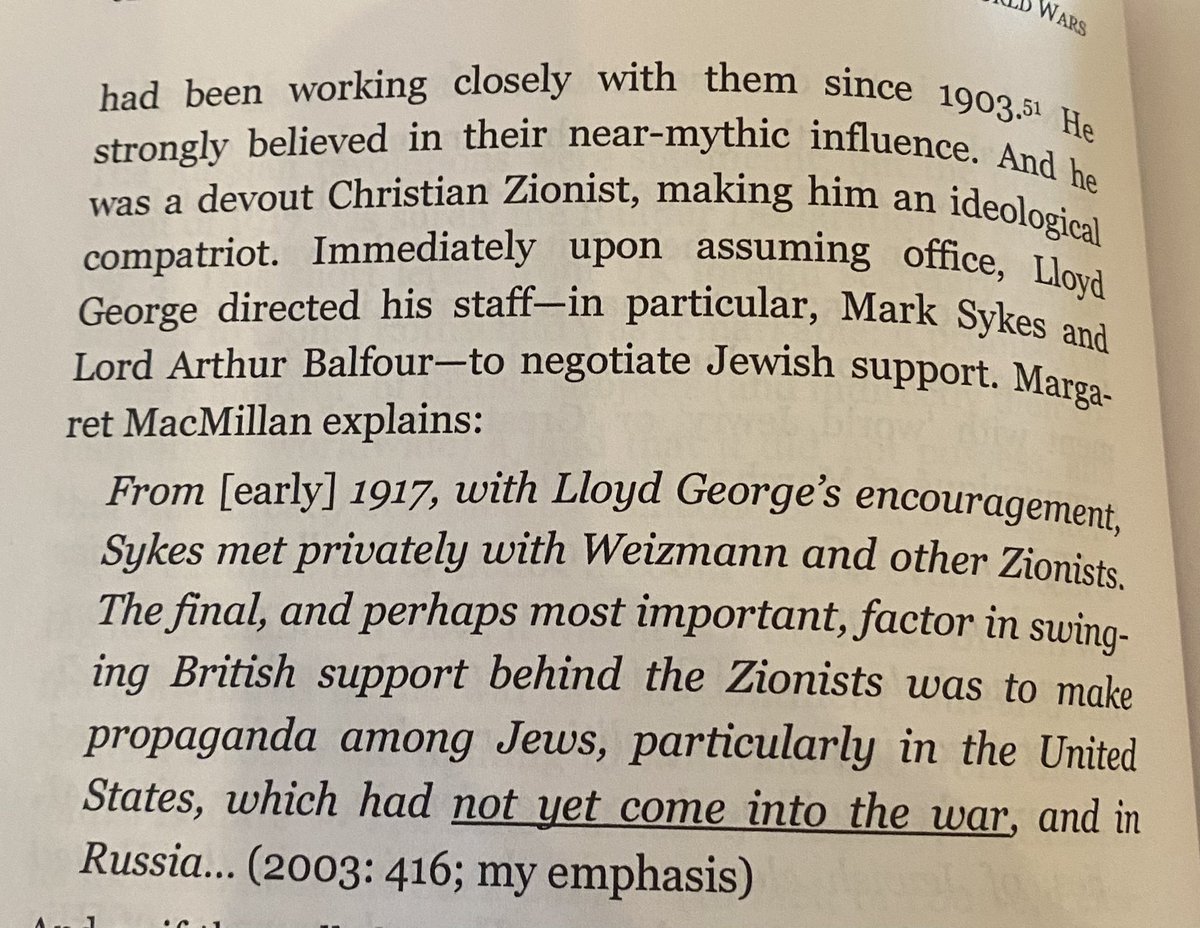 Then of course, we have the most obvious sign of all. The Balfour declaration. Signed in 1917. Here is lord Rothschild (another Jewish banker) going over its importance. This was the deal where the British government promised Palestine (a land they didn’t control at the time) to world Jewry for a homeland. The astute observer will say, well this was publicly signed after the US entered the war, so it couldn’t have been part of the deal to get the US into world war 1. Not so fast. Remember that our inside source Benjamin Freedman said the deal was reached ahead of time, and the Balfour declaration was just the public display of this deal. But we also have Canadian Historian Margaret Macmillan that Zionist friendly and British prime minister Lloyd George and his subordinates were courting the Zionist for to pressure the US to come into the war, well before the official declaration. 🧵 6/19