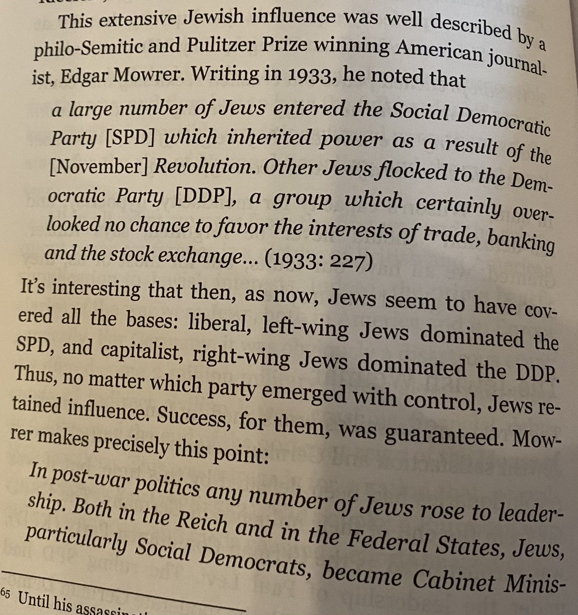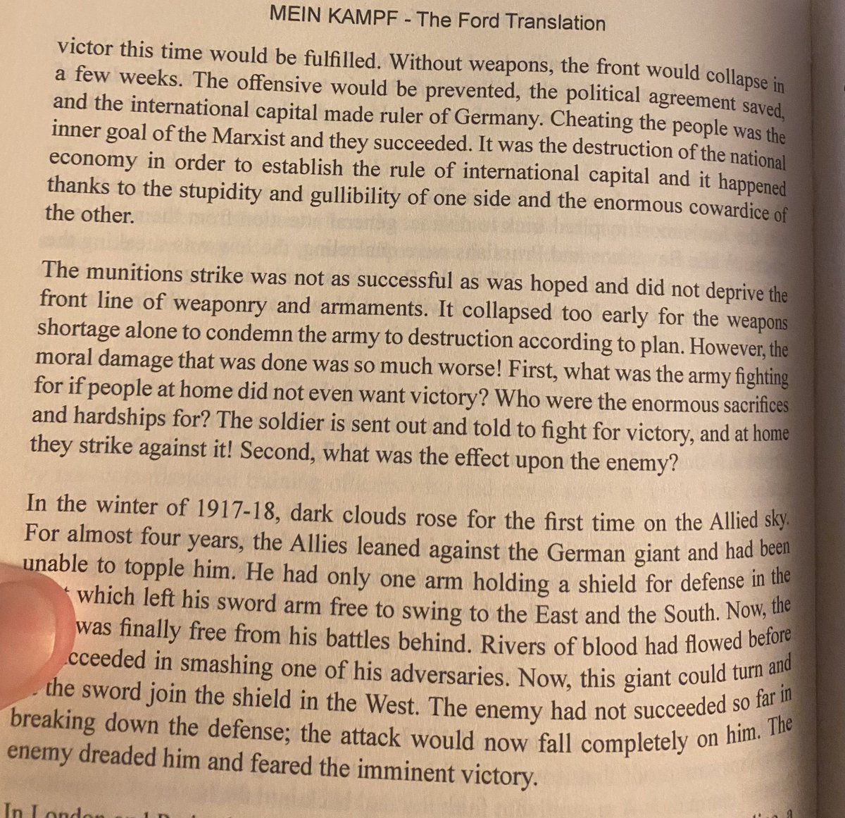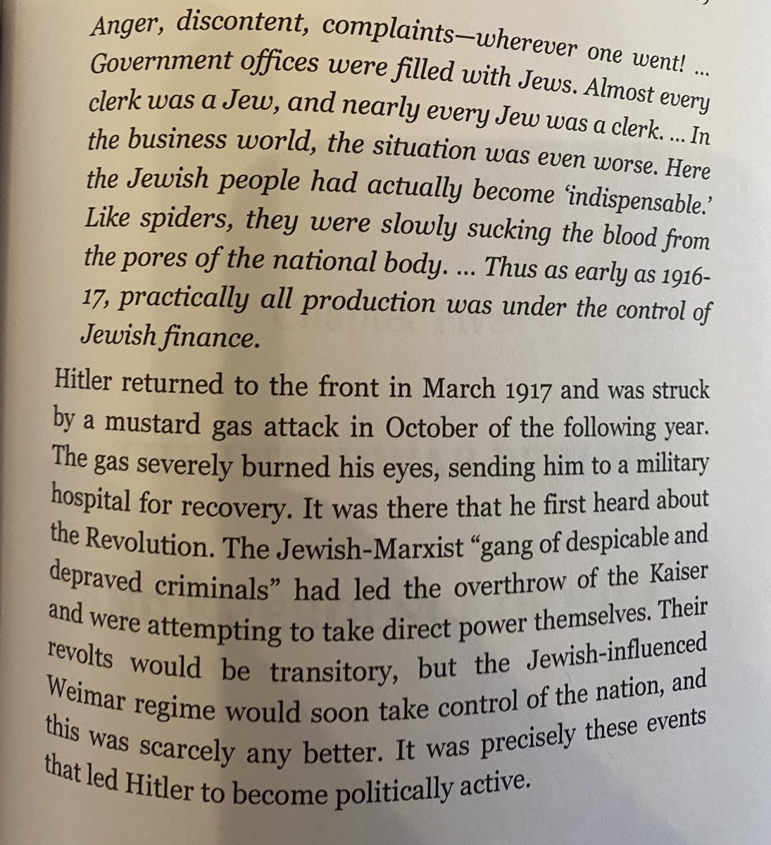Another thing Hitler pointed out in Mein Kampf, is that Jews within Germany conspired against the German nation in the last 2 years of Wrold War 1. Before you write off Hitler as a crazed antisemite, consider that it matches exactly with the record given by the Jewish man Benjamin Freedman, and how worldwide Jewish interest shifted from being predominantly anti Russia (because of the Tsar) to focusing on Germany because of the Balfour deal. (And the fact that Jewish revolutionaries were making headway in Russia at the same time.) Remember that German Jews during world war 1 largely had tons of commercial and banking power. It was not like world war 2 at all. There fellow Germans would be none the wiser if they had a different agenda. 🧵 8/19