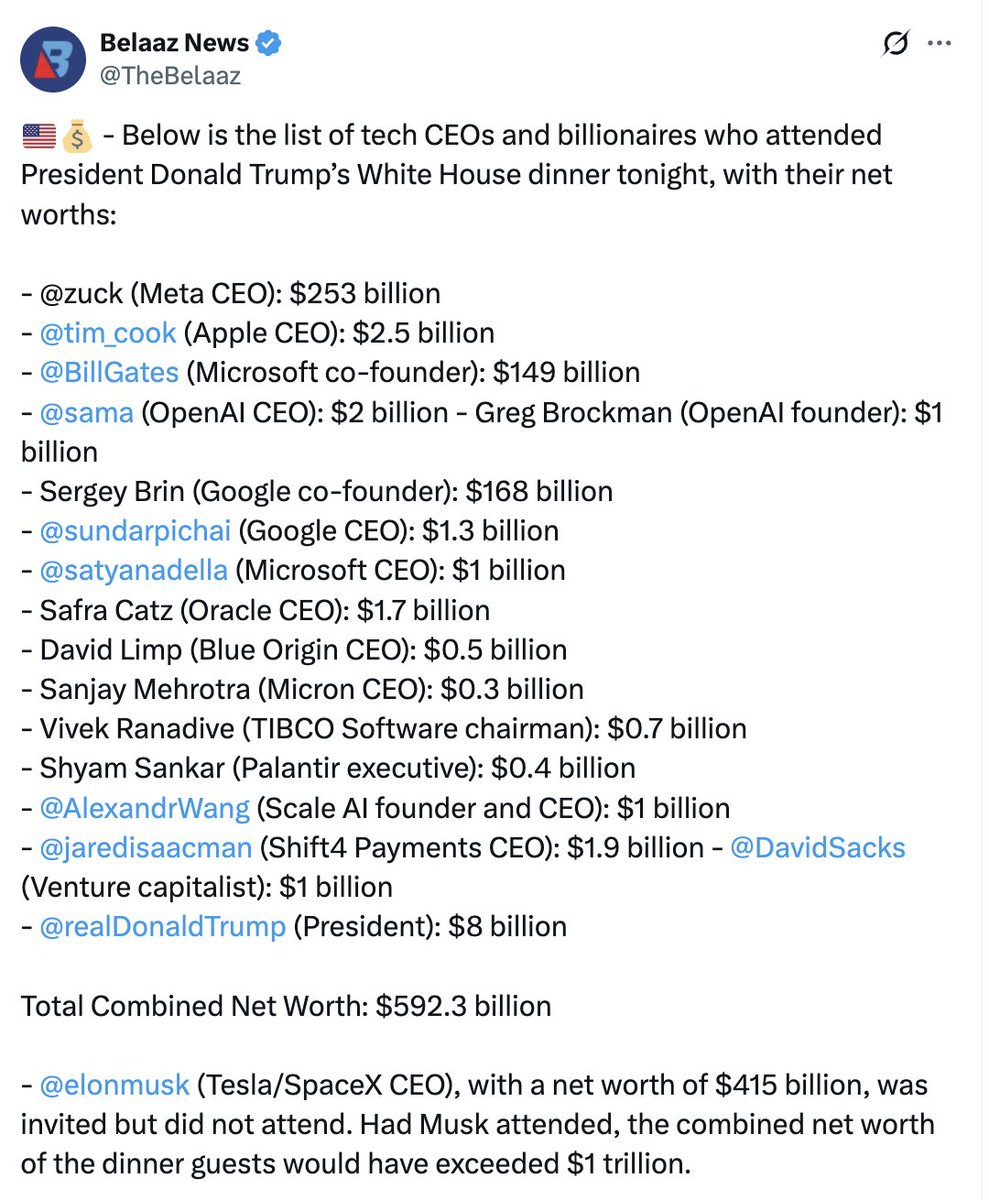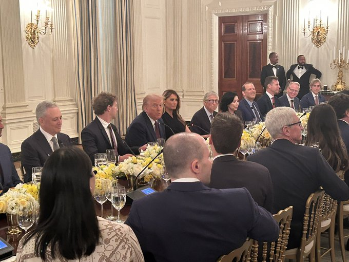 Musk's absence screams volumes. Gates shows up. Zuckerberg shows up. Cook shows up. But Tesla's CEO sends a representative while competitors pledge hundreds of billions. Speculation: Falling out over space contracts? Regulatory battles? Or is Musk building his own political machine?