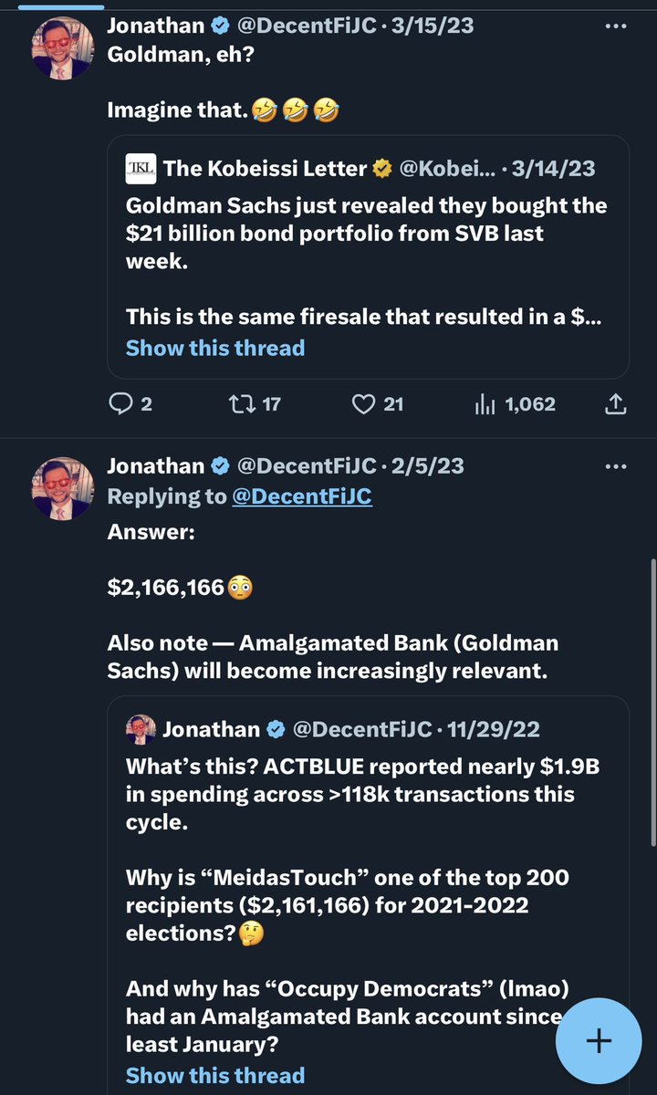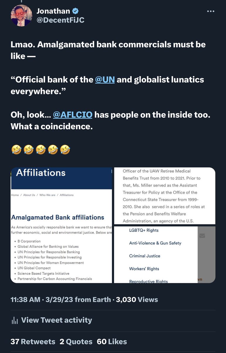 Amalgamated Bank is a big time UN-operatives bank — they currently fund tons of these lunatic progressive NGO/501c3 activist groups and their operative Twitter accounts. (MeidasTouch; OccupyDemocrats; Color of Change; etc.) Goldman Sachs is VERY closely involved and might’ve actually been Amalgamated’s largest shareholder throughout all of 2019 (6.5%). And this perfectly coincides with Amalgamated’s timeline of being the first bank to the table to accept and implement UN banking agendas — UNPRB. Goldman has since tried to mask the significance of their interests, divesting 60% of their direct ownership of Amalgamated in 02/2020. (They’re still Amalgamated’s 6th largest shareholder today.)