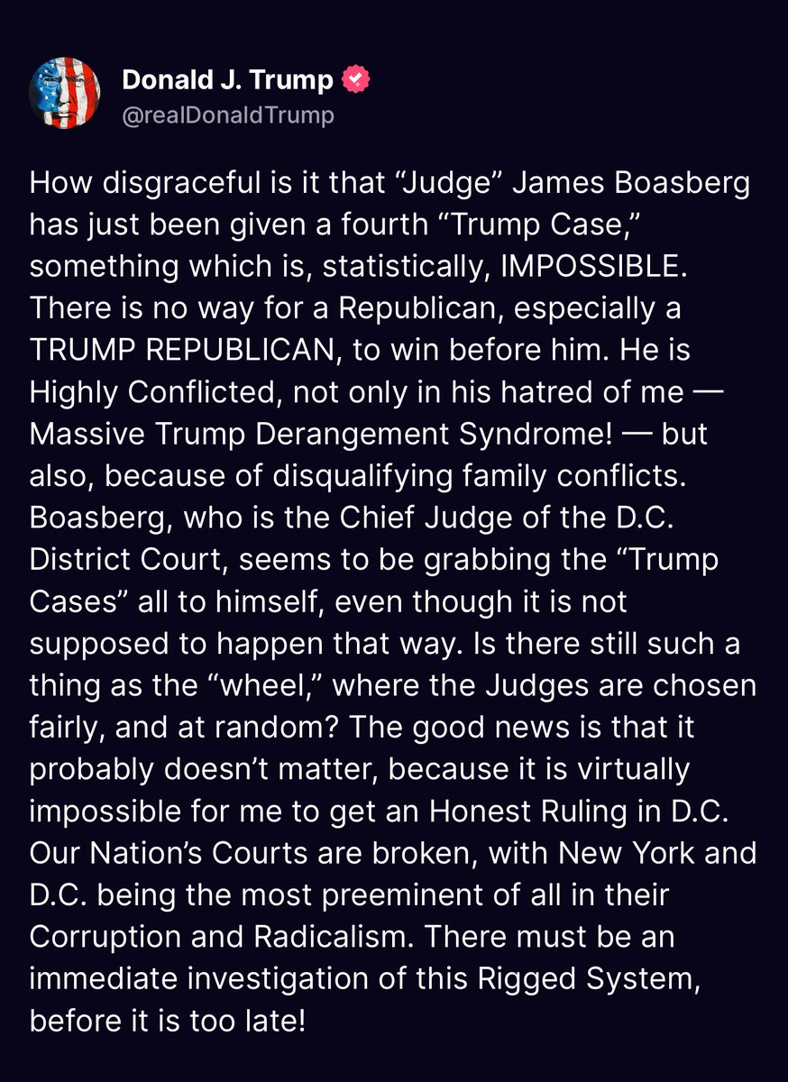 🚨 JUST IN: President Trump calls for an “IMMEDIATE INVESTIGATION” as activist Judge Boasberg gets a FOURTH Trump case Trump points out how corrupt DC’s courts are, and that it’s “statistically impossible” for Boasberg to be chosen “at random” over and over again. “He seems to be grabbing the Trump cases all to himself, even though it’s not supposed to happen that way.” RIGGED SYSTEM!