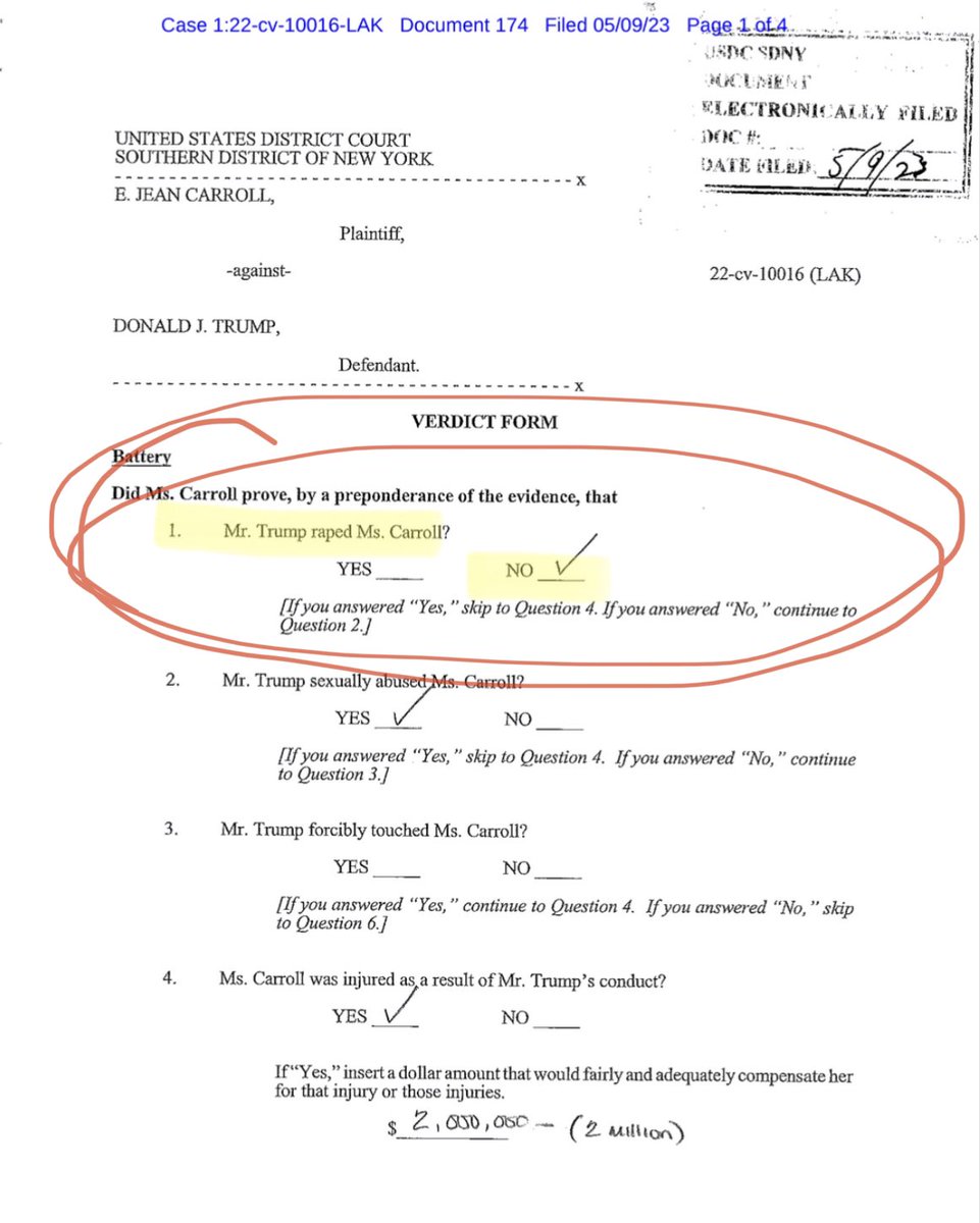 How can Judge Kaplan actually say "the fact that Mr. Trump sexually abused - 𝗶𝗻𝗱𝗲𝗲𝗱, 𝗿𝗮𝗽𝗲𝗱 - Ms. Carroll has been conclusively established”, [emphasis added], whereas the jury verdict form literally says the opposite? Kaplan needs to be impeached YESTERDAY. This is absolutely insane.