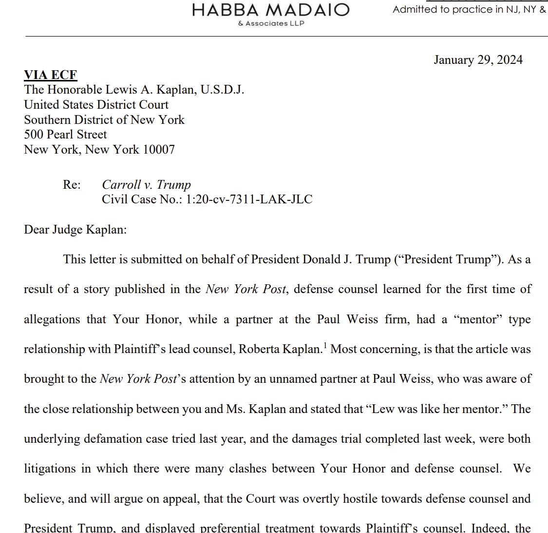 Judge Lewis Kaplan presided over the Trump Civil Trial. He is a Clinton appointee. Several noted legal scalars, included Johnathan Turley stated that judge Kaplan allowed evidence to be presented to the jury that had nothing to do with the event in question. (He stacked the evidence unfavorable to Trump). This will help Trump's defense upon appeal. The plaintiff E. Jean Carroll could not even remember the date when her alleged event occurred or have a reason for not reporting it to authorities.