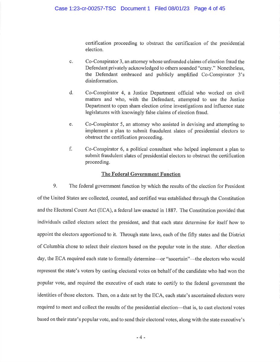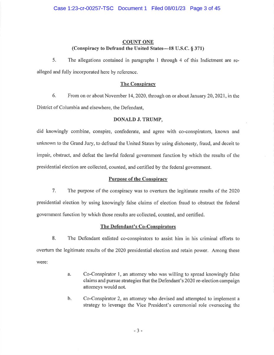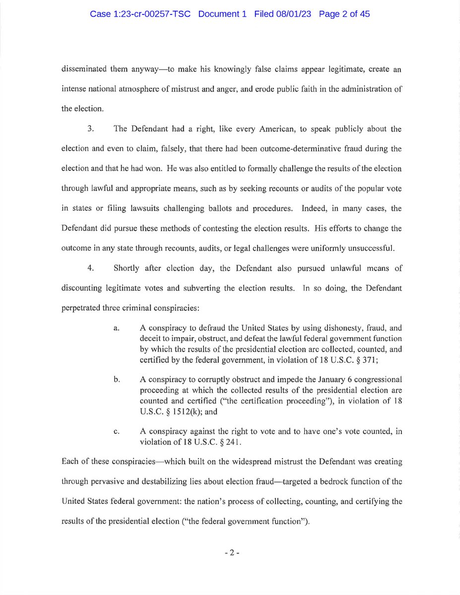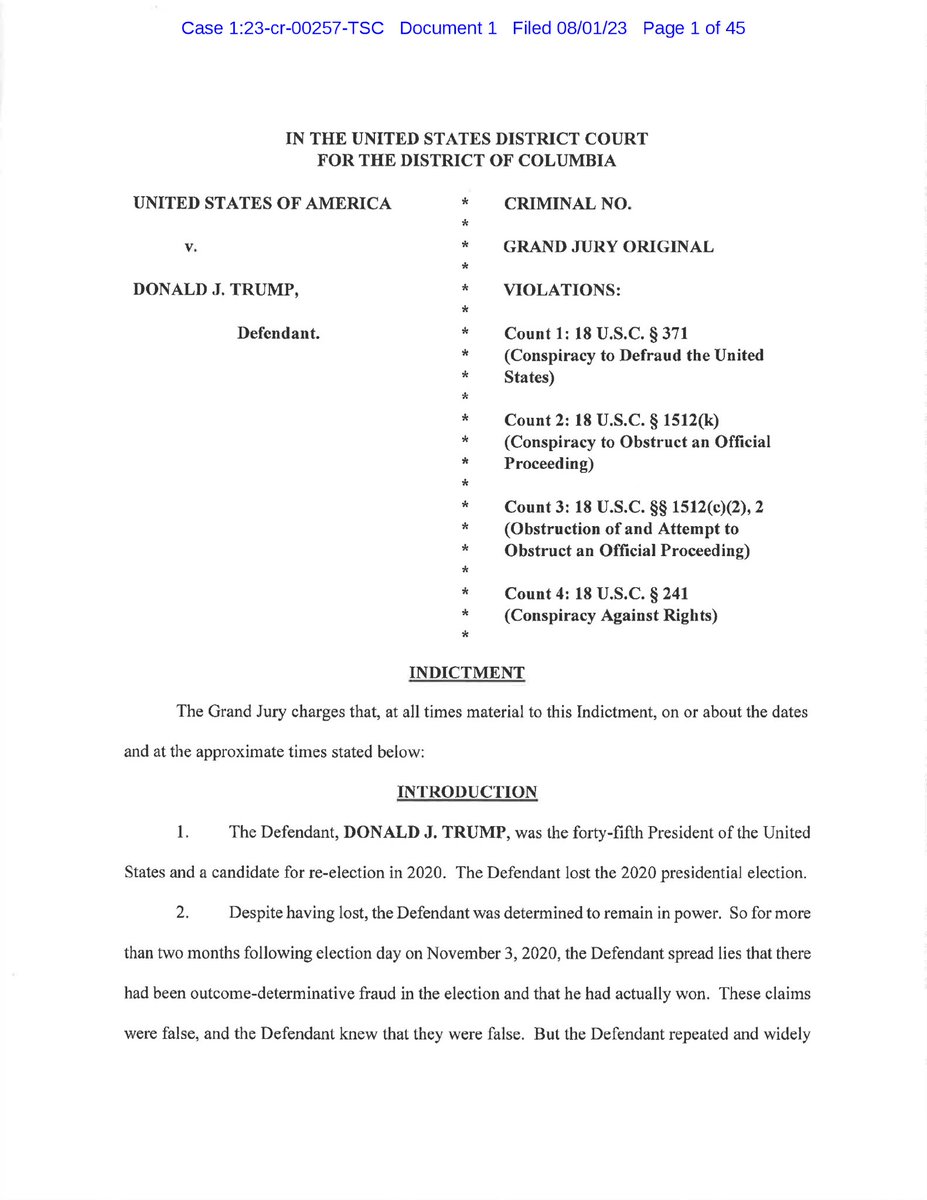 Here is the full Trump indictment. Just read it quickly. Appears to be a recitation of already reported allegations. Clear intent to criminalize a legal theory that Trump’s attorneys pursued. Garbage indictment. https://storage.courtlistener.com/recap/gov.uscourts.dcd.258149/gov.uscourts.dcd.258149.1.0_1.pdf