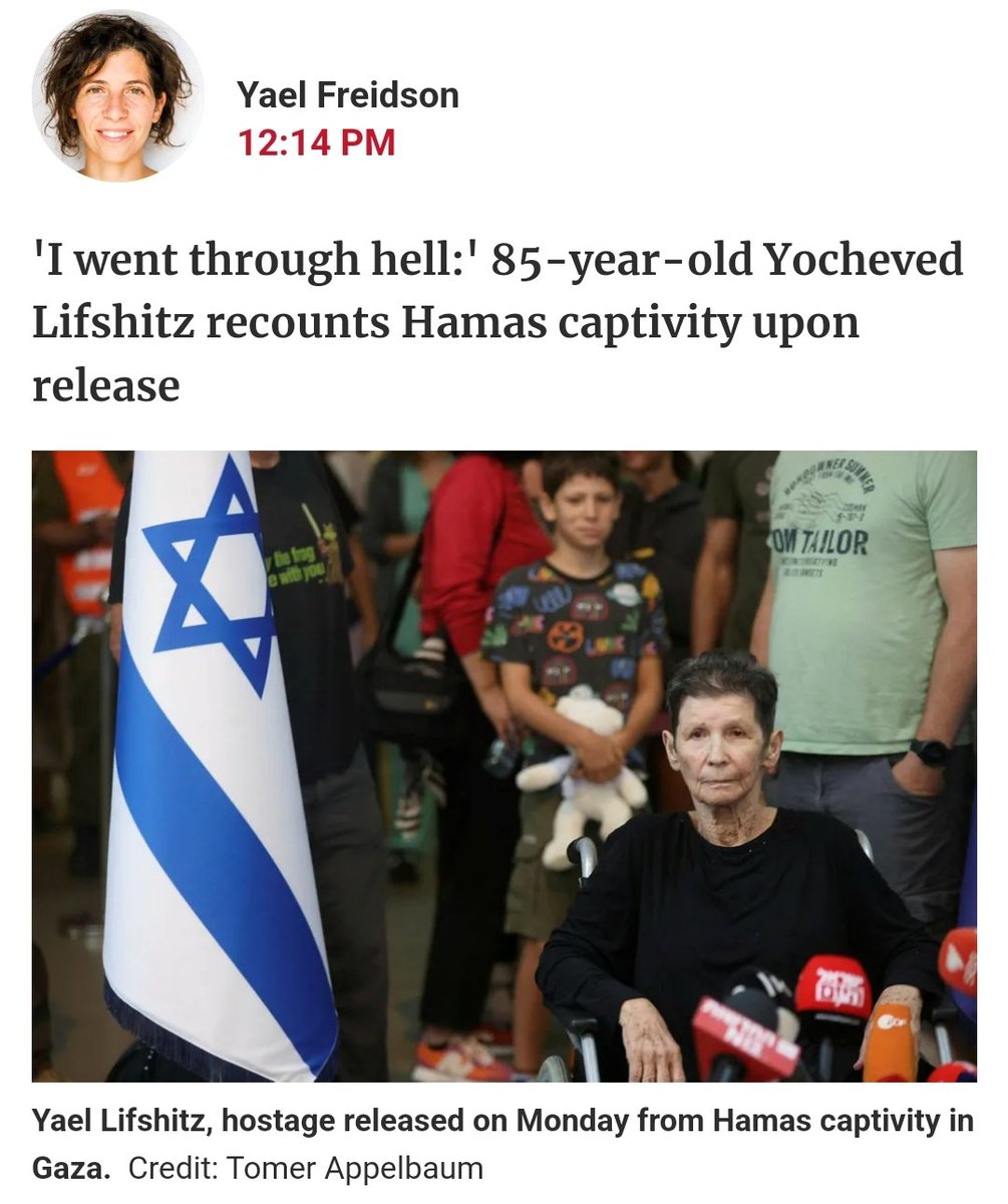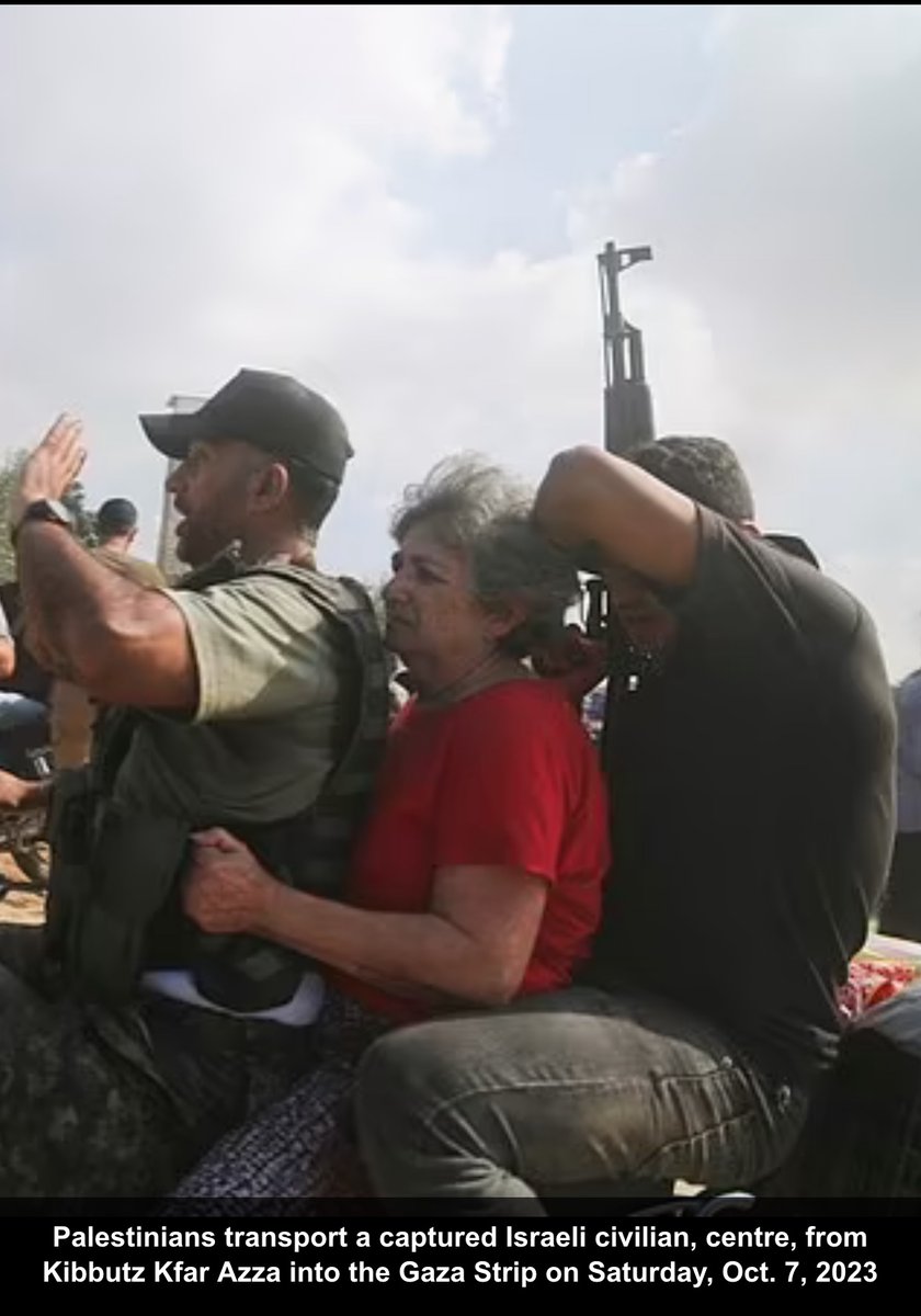 HOSTAGES NOT RAPED. NO BROKEN PELVISES. DAILY MEDICAL CARE. FOOD. TOILETS CLEANED WITH LYSOL. CLEAN MATTRESSES. Such are the details given by Yocheved Lifshitz, 85-year old hostage survivor released by Hamas, after spending several days as a hostage in the tunnels of Gaza. Below she can be seen shaking hands w/her captors & telling them "Salam," peace.