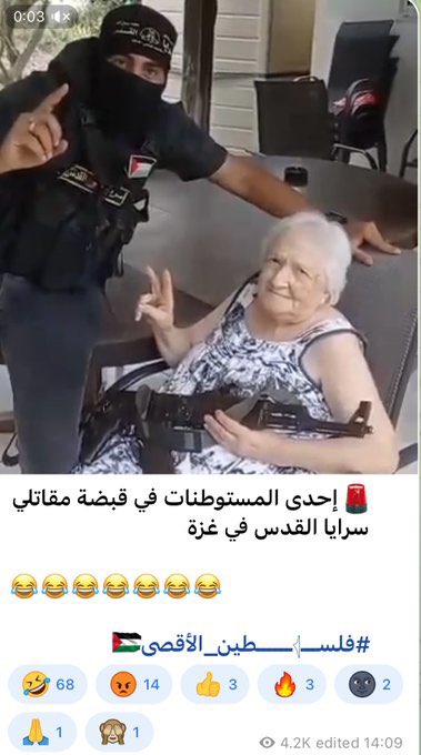 As a 3rd-party observer who has been critical of Israel's disproportionate retaliation against innocent Gazans, I likewise condemn Hamas for beating this woman & stealing her stuff. Unnecessary and wrong. I understand POWs are a reality of war, but making hostages of elderly civilians is wrong. So I'm glad Hamas did the right thing in taking care of her and releasing her. I'm tremendously glad that she and others of her group are going to be all right. It's a huge sigh of relief! May the rest of the hostages come home OK as well. And may the IDF stop collectively punishing thousands of innocent Gazans for the heinous actions of a few.