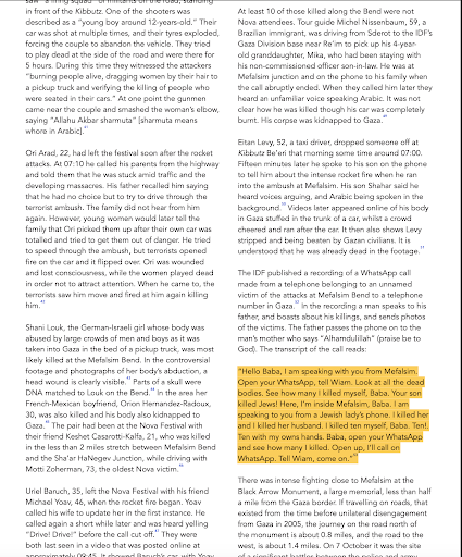 📞 Phone call from a Hamas terrorist to his father – using the phone of a murdered Israeli woman: "Hello Baba, I am speaking with you from Mefalsim. Open your WhatsApp, tell Wiam. Look at all the dead bodies. See how many I killed myself, Baba. Your son killed Jews! Here, I’m inside Mefalsim, Baba. I am speaking to you from a Jewish lady’s phone. I killed her and I killed her husband. I killed ten myself, Baba. Ten!. Ten with my owns hands. Baba, open your WhatsApp and see how many I killed. Open up, I’ll call on WhatsApp. Tell Wiam, come on.” Here are a few more taken from the bodycam footage of Hamas terrorists and victim's phones : 📍The Murder of Adi Vital-Kaplon – Kibbutz Holit During the infiltration of Kibbutz Holit, Hamas terrorists were filmed entering the home of Adi Vital-Kaplon. She tried to shield her 4-year-old son and her 3-month-old baby. After murdering her, the terrorists filmed themselves placing shoes on the baby’s tiny feet and rocking the cradle where he lay. The video was later uploaded to Hamas propaganda channels. 📍 The Arava-Elkayam Family – Kibbutz Nahal Oz At the home of the Arava-Elkayam family in Kibbutz Nahal Oz, terrorists from Hamas and Islamic Jihad broke in. Noam Elkayam, 46, was shot in the leg. The attackers used his phone to livestream an interrogation of the entire family on Facebook. On camera were his partner, Dikla Arava (51), his daughters Dafna (15) and Ella (8), and his stepson Tomer (17). Later, the terrorists forced Tomer—at gunpoint—to knock on neighbors’ doors and lure them outside, all while continuing the live broadcast. Tomer was later murdered, and his body was found outside the kibbutz. 📍 The Killing of Joshua Molle – Tanzanian Student, Nahal Oz Joshua Molle, a 21-year-old student from Tanzania, was brutally attacked by militants from the Al-Aqsa Martyrs’ Brigades and the National Resistance Brigades. In the first video, he is seen with his hands raised, his face bloodied, surrounded by six attackers who beat him and scream at him. A second video, filmed on a terrorist’s bodycam, shows Molle lying on the ground, bleeding from stab wounds to his abdomen. One terrorist stands over him holding a blood-stained knife. Another stomps on his chest. 📍 The Murder of Bracha Levinson – Kibbutz Nir Oz At Kibbutz Nir Oz, militants broke into the home of 74-year-old Bracha Levinson. Her family, who had been in contact with her via text messages, learned of her death not through official channels—but through a Facebook post published from her own account. The post was a video showing Levinson lying lifeless on her living room floor, in a pool of blood, surrounded by armed men shouting in the background. The footage had been uploaded by her killers. The Roberts Report is filled with countless documented materials—taken directly from Hamas bodycams, audio recordings, and videos captured on the phones of their victims. Many of these were later uploaded by Hamas operatives and other Palestinian users to social media platforms, especially Telegram. Let’s move on to some of the most extreme and horrifying cases documented in the report—if such a distinction can even be made. 👇